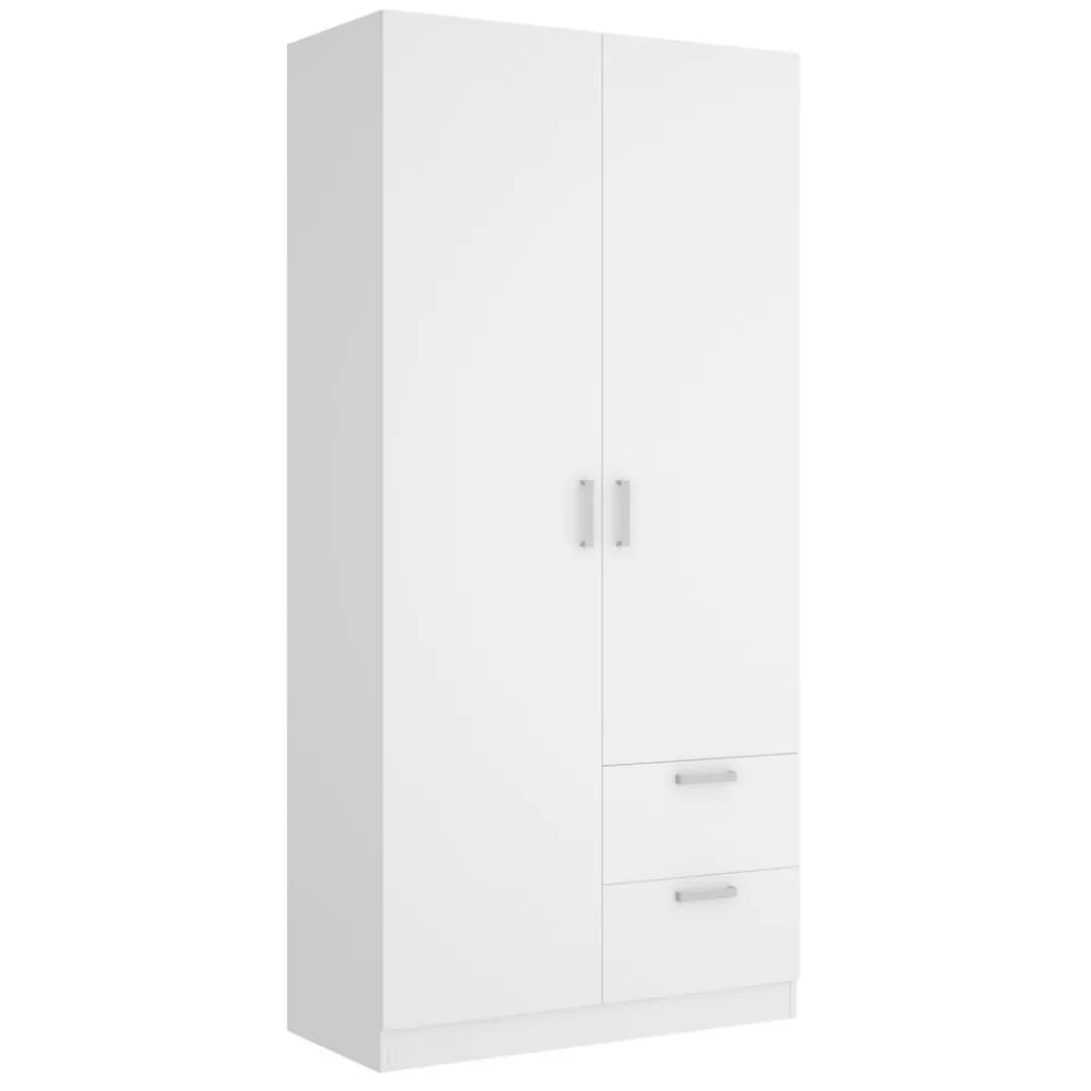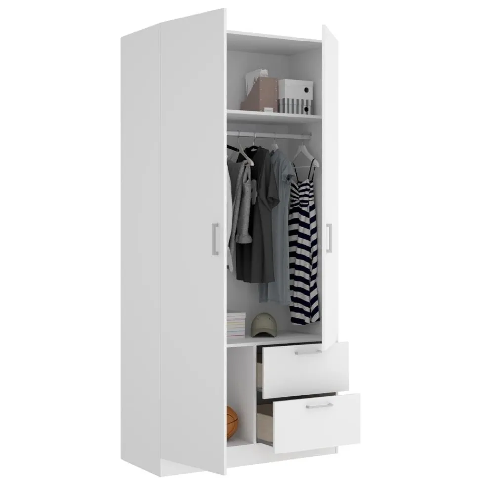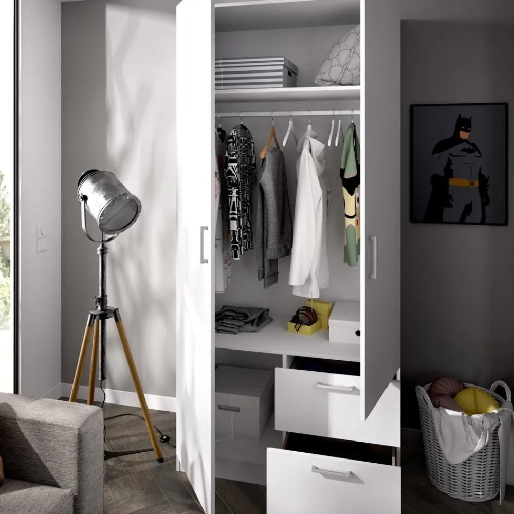 Armario de 2 puertas y 2 cajones de 100 cm de ancho en color blanco, ideal hasta para la habitación más pequeña, ofreciendo gran capacidad de almacenamiento y un diseño elegante.