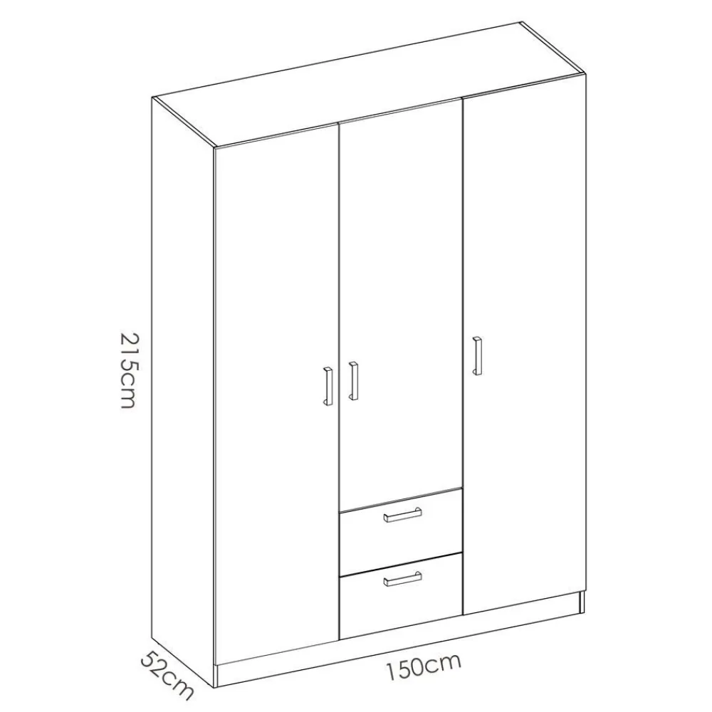 - Armario 3 puertas y 2 cajones: 150 cm (ancho) x 215 cm (alto) x 52 cm (fondo).