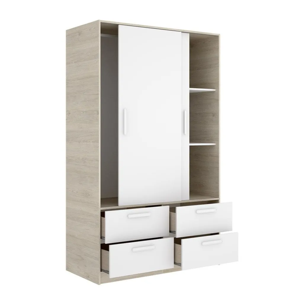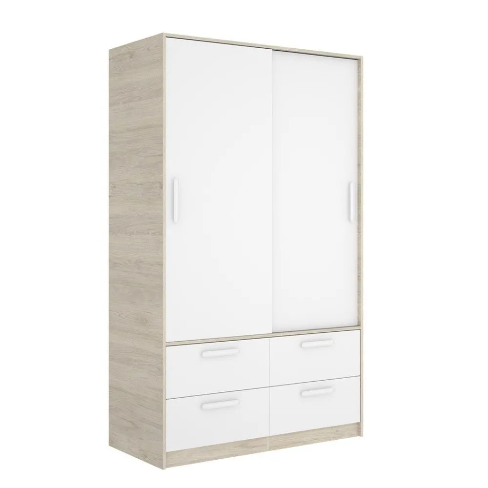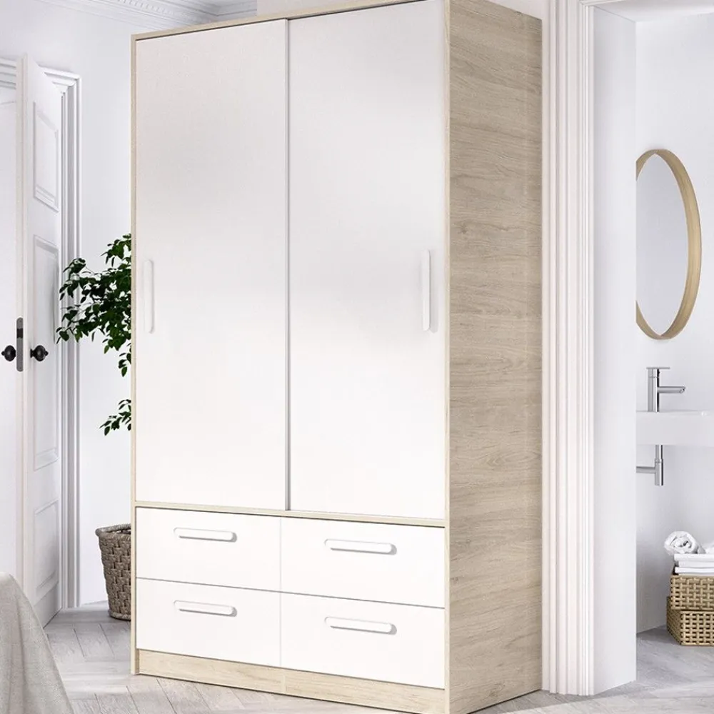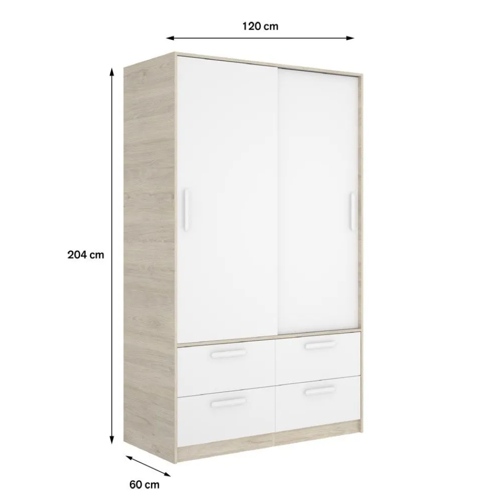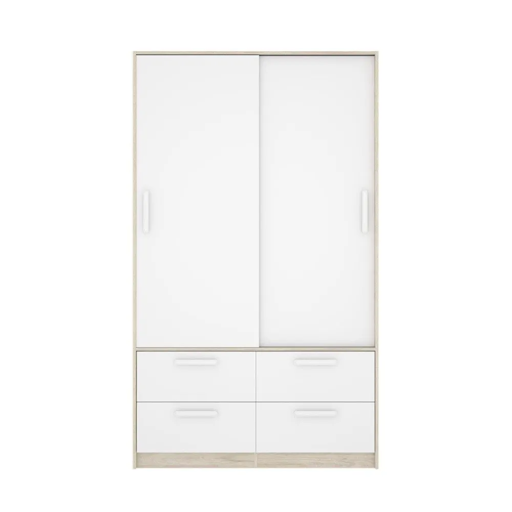Armario de 2 puertas correderas y 4 cajones de 120 cm de ancho, en color blanco combinado con roble natural, ideal para cualquier dormitorio o vestidor, proporcionando gran capacidad de almacenamiento.