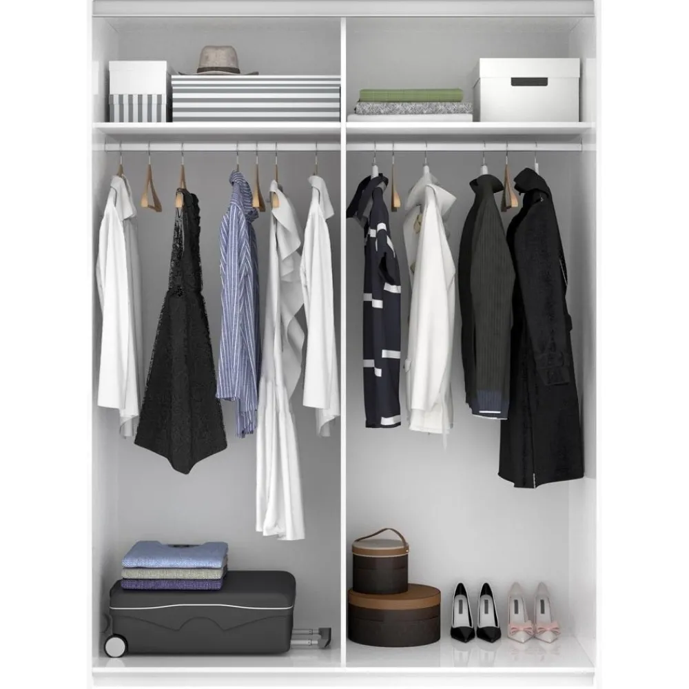 El interior es diáfano, está dividido en dos partes por una pared central, en cada uno de los lados lleva un estante superior y una barra de colgar metálica para que la ropa este siempre sin ninguna arruga.