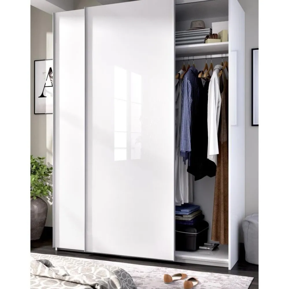 El armario de puertas correderas Slide 150 cm blanco brillo es un ropero que se integra perfectamente tanto en dormitorios de matrimonio, como en habitaciones juveniles, su anchura reducida y su acabado en un bonito color blanco brillo lo permiten combinar perfectamente en todas las situaciones.