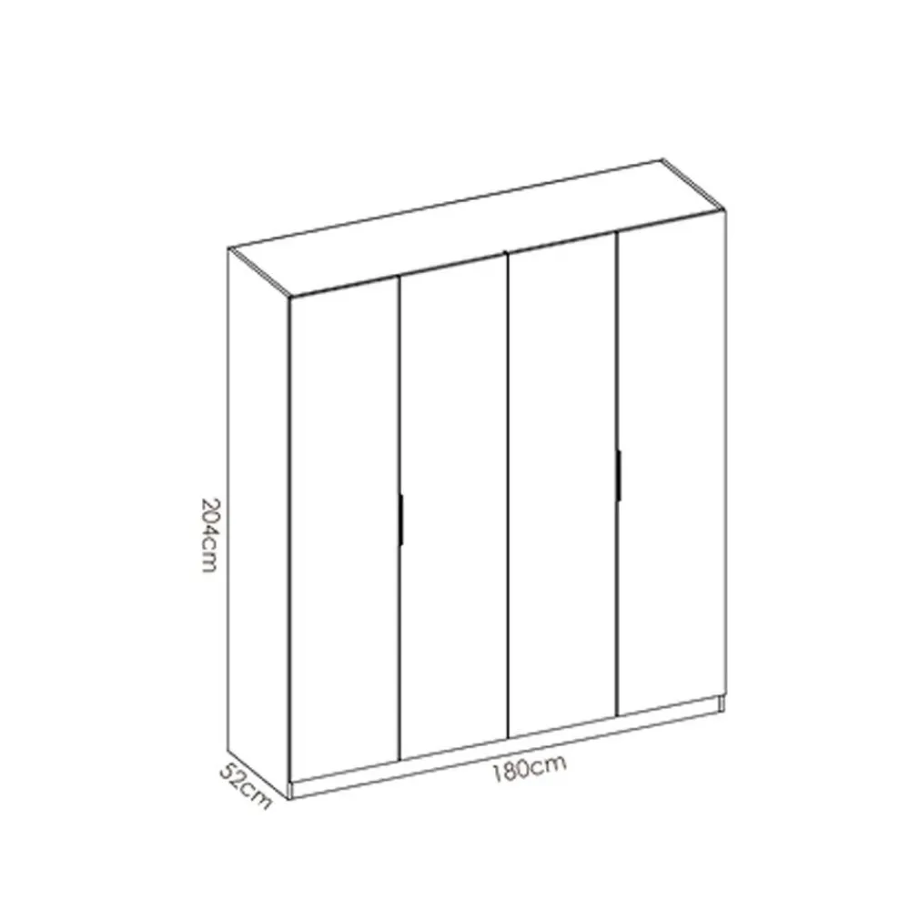 - Armario 4 puertas: 180 cm (ancho) x 204 cm (alto) x 52 cm (fondo).