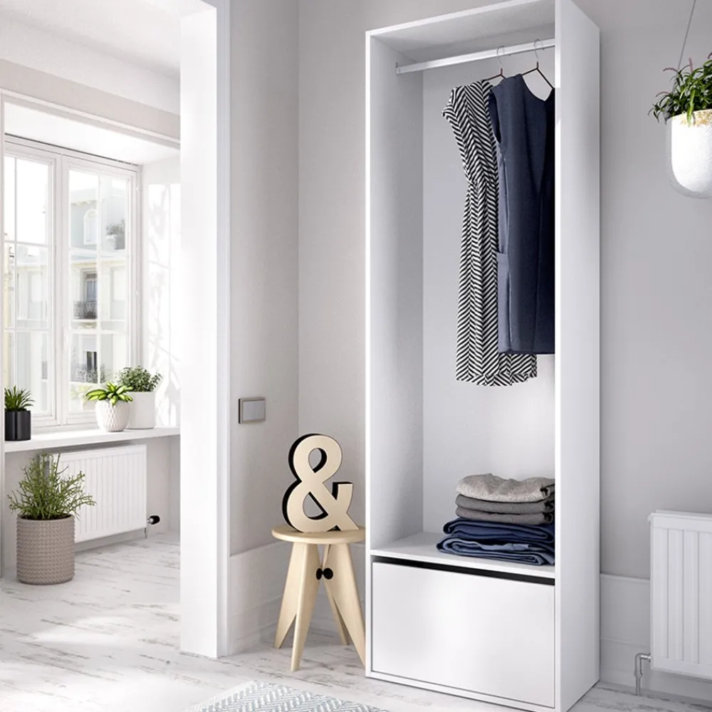 - Armario vestidor sin puertas: 60 cm (ancho) x 205 cm (alto) x 45 cm (fondo).