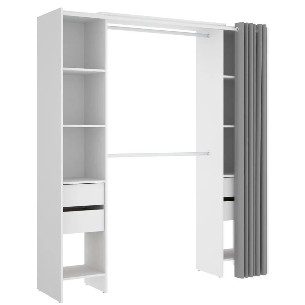 Vestidor blanco con mucha capacidad de almacenaje compuesto por dos laterales, unidos por la barra de colgar, con estantes y dos cajones en cada uno de ellos. Dispone de una cortina para proteger toda tu ropa