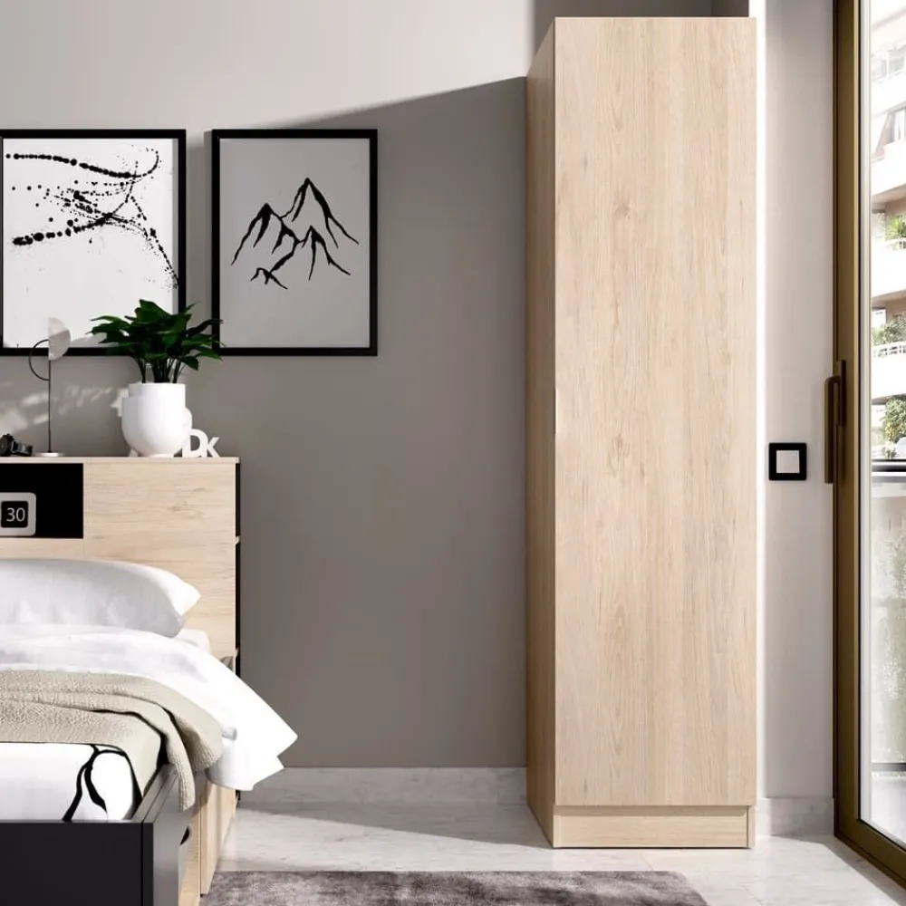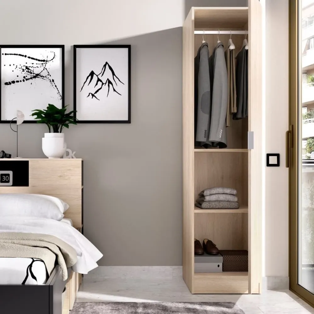 El en color Roble Natural es la solución ideal para aquellos que buscan maximizar el almacenamiento en espacios pequeños. Con una estética moderna y funcional, este armario combina un diseño elegante con una estructura resistente, garantizando durabilidad y estilo en cualquier habitación.