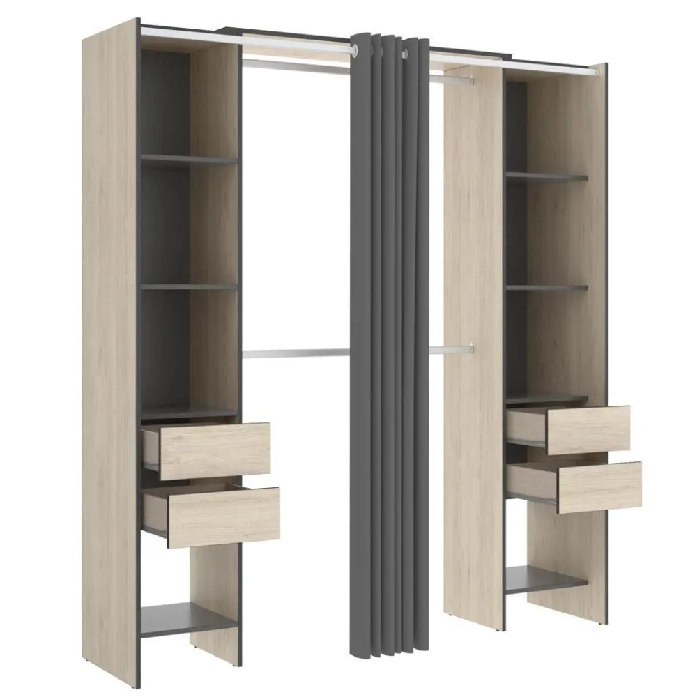 Vestidor en color natural y grafito, con mucha capacidad de almacenaje compuesto por dos laterales, unidos por la barra de colgar, con estantes y dos cajones en cada uno de ellos. Dispone de una cortina para proteger toda tu ropa