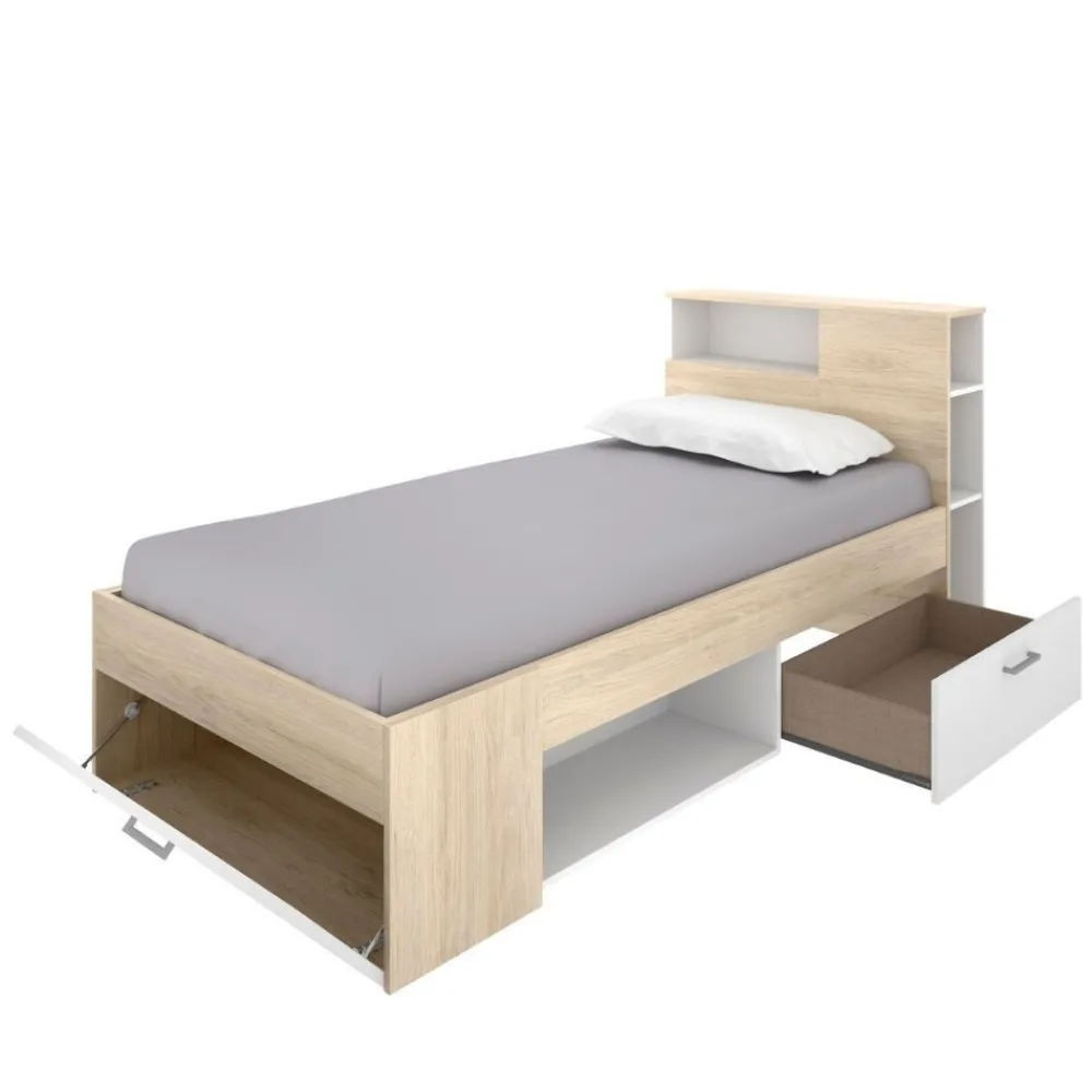 DEKIT Camas Baratas^Cama Compacta Con Cabecero Integrado Lanka Roble Natural – Blanco Con Un Cajón Y Puerta 99 X 96 X 218 Cm