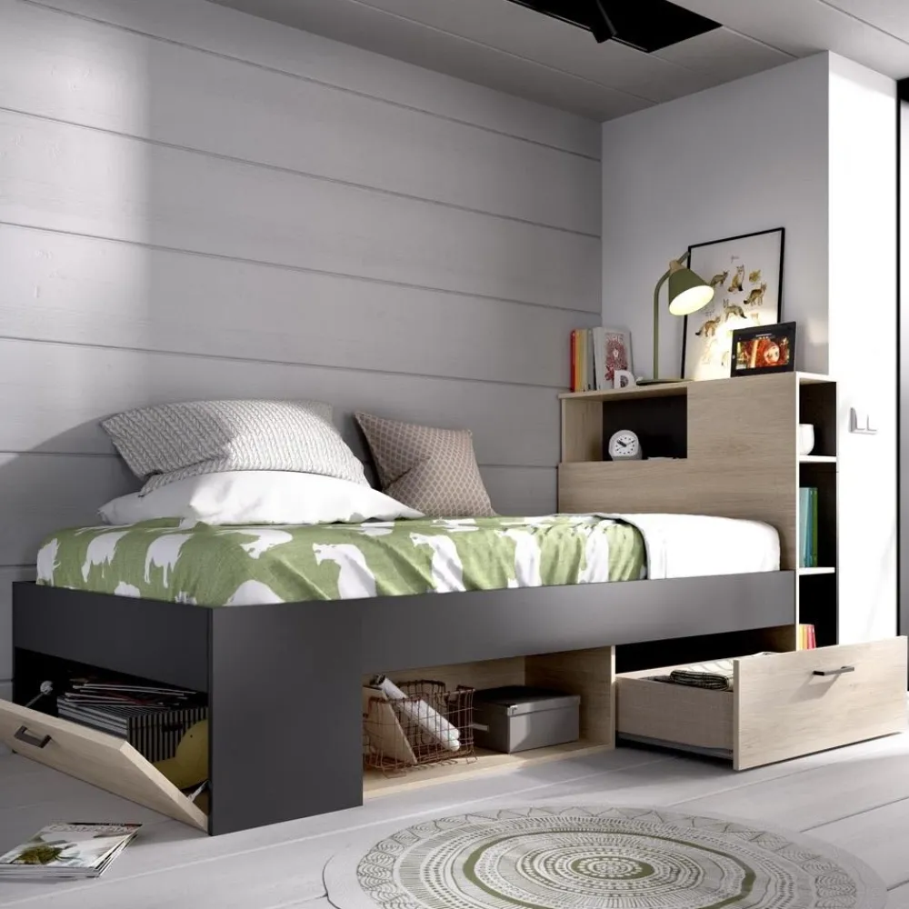 Bonita cama infantil con un cajón, una puerta batiente y hueco de almacenamiento, dispone además de un cabecero con estantes, para tener la habitación siempre ordenada. Cama infantil en color roble natural y grafito. Requiere un somier de 90 x 190 cm.