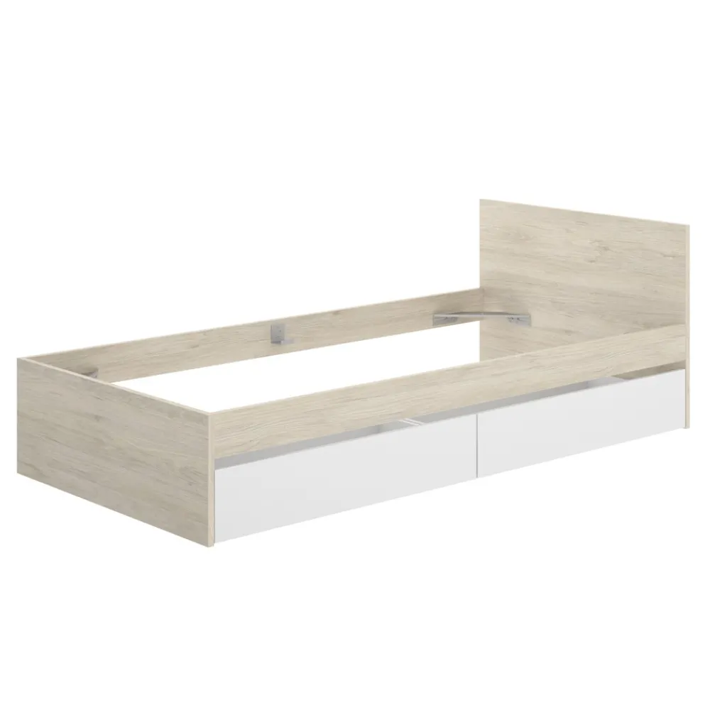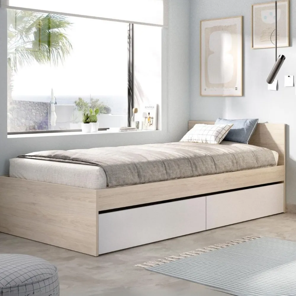 La es la mejor opción para dormitorios con espacio reducido. Este diseño moderno combina el color roble natural con el blanco, proporcionando un aspecto nórdico y elegante a cualquier habitación juvenil. La estructura robusta y los materiales de alta calidad garantizan durabilidad y resistencia, mientras que los dos cajones inferiores ofrecen un amplio espacio de almacenamiento para ropa de cama, juguetes o material escolar.
