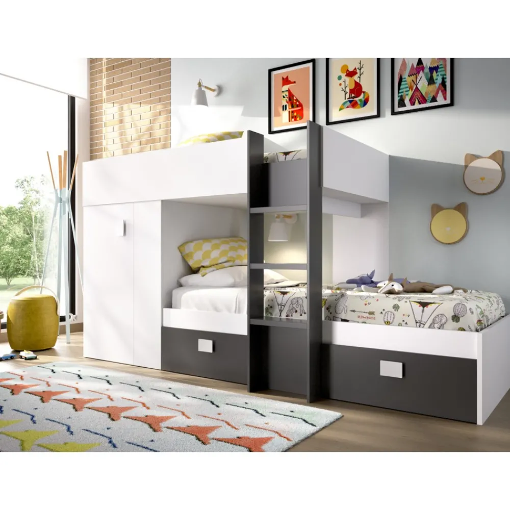 Divertida composición en color blanco y grafito para habitación juvenil, ideal para niñas y niños, que está compuesta por un gran armario ropero situado bajo la cama superior y dos camas individuales de 90 cm unidas por una bonita y funcional escalera. Además, la cama inferior dispone de dos grandes cajones en los que también podrás guardar un montón de ropa o juguetes.