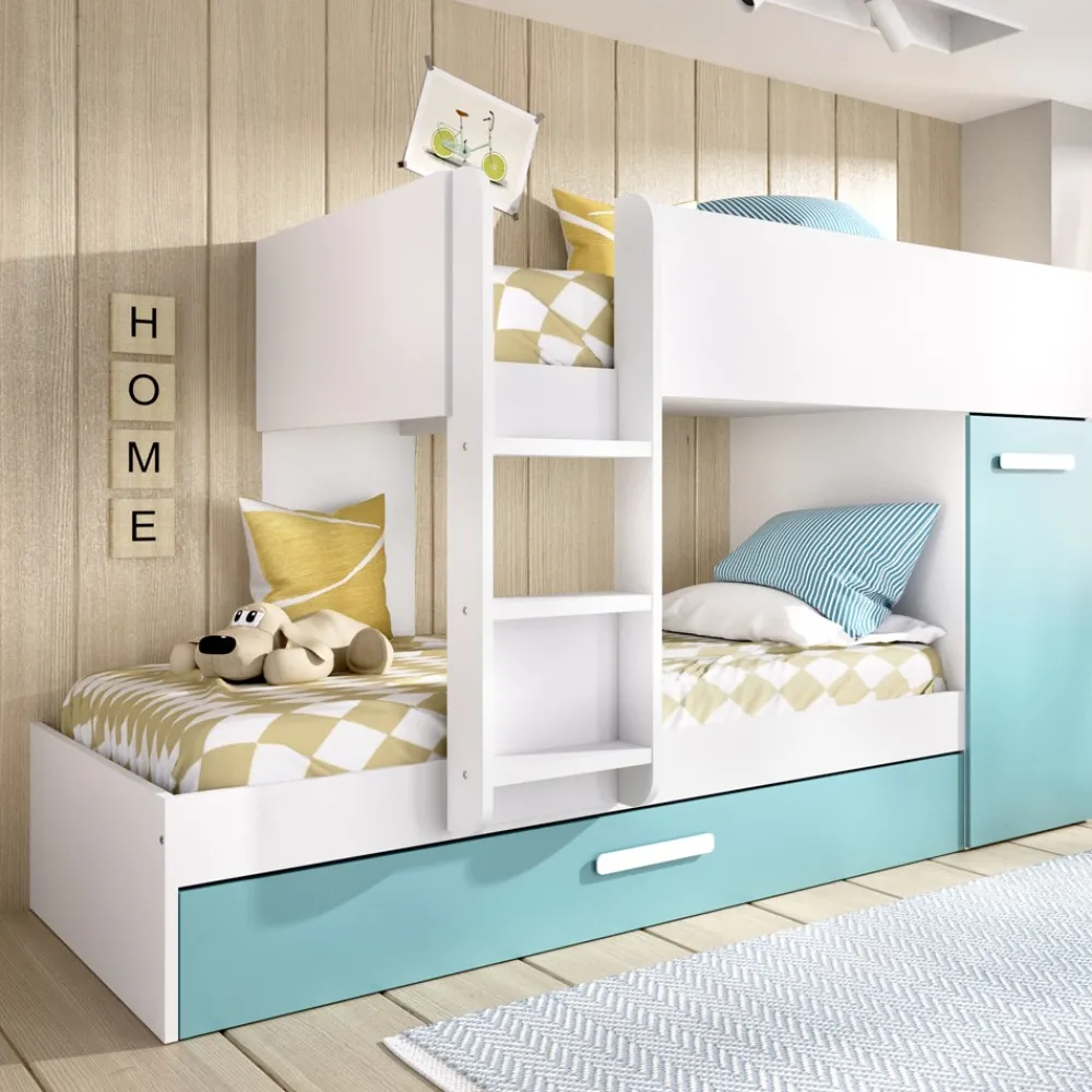 La es la solución perfecta para habitaciones infantiles con espacio limitado. Esta cama tren consta de un armario con barra y estante, más un arrastre para otra cama adicional o para utilizar como almacenamiento, permitiendo un total de 3 camas. Su diseño en color blanco combinado con esmeralda la hace ideal para cualquier estilo de decoración infantil, aportando un toque de frescura y modernidad.