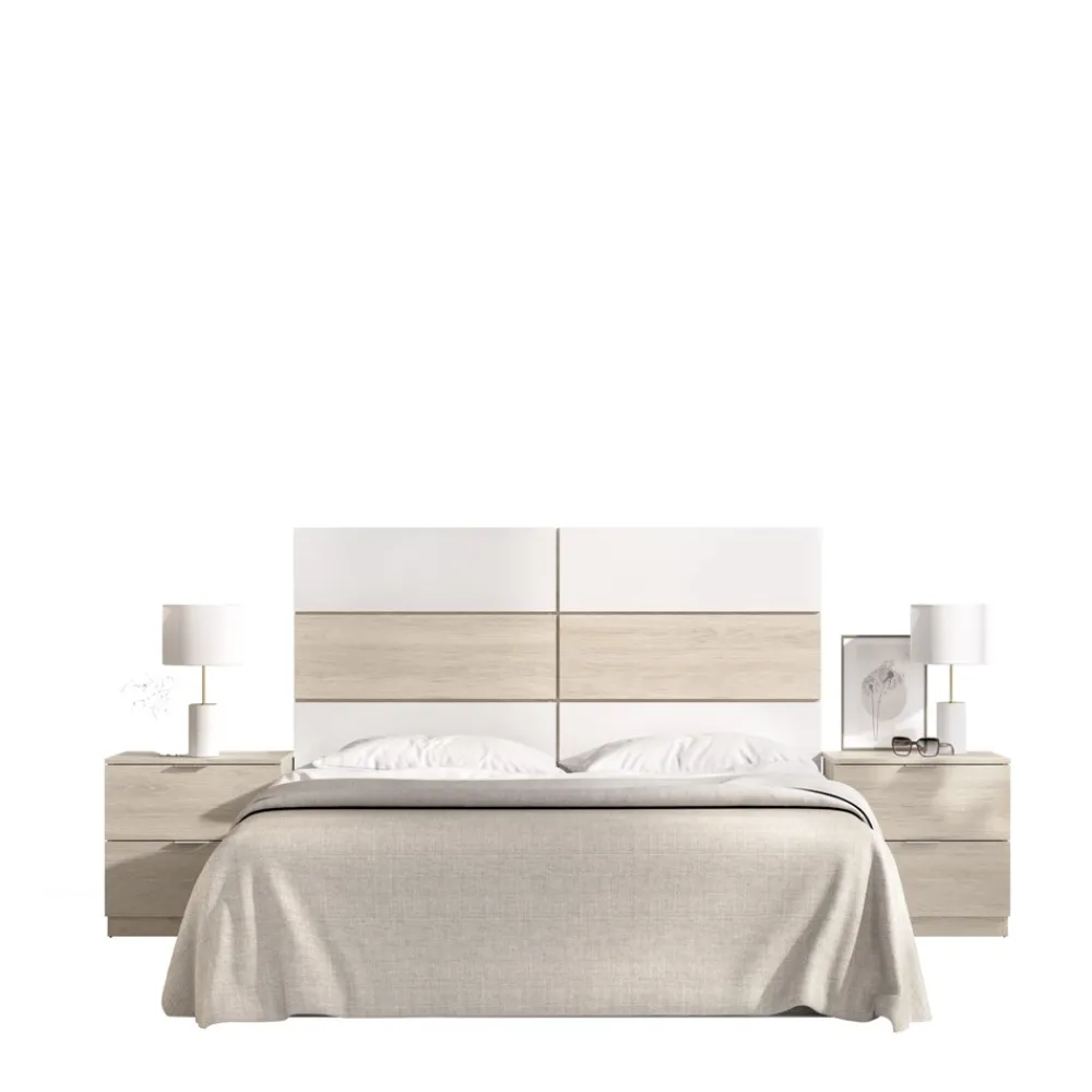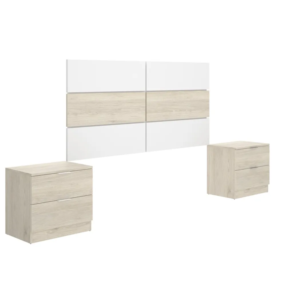 El conjunto es la opción ideal para aquellos que buscan una combinación perfecta de estilo moderno y funcionalidad. Diseñado en un elegante color blanco mate con detalles en roble natural, este cabecero aporta un toque de sofisticación y actualidad a cualquier dormitorio. Las dos mesitas de noche incluidas cuentan con dos cajones cada una, proporcionando un amplio espacio de almacenamiento para mantener tus objetos personales organizados y a mano.