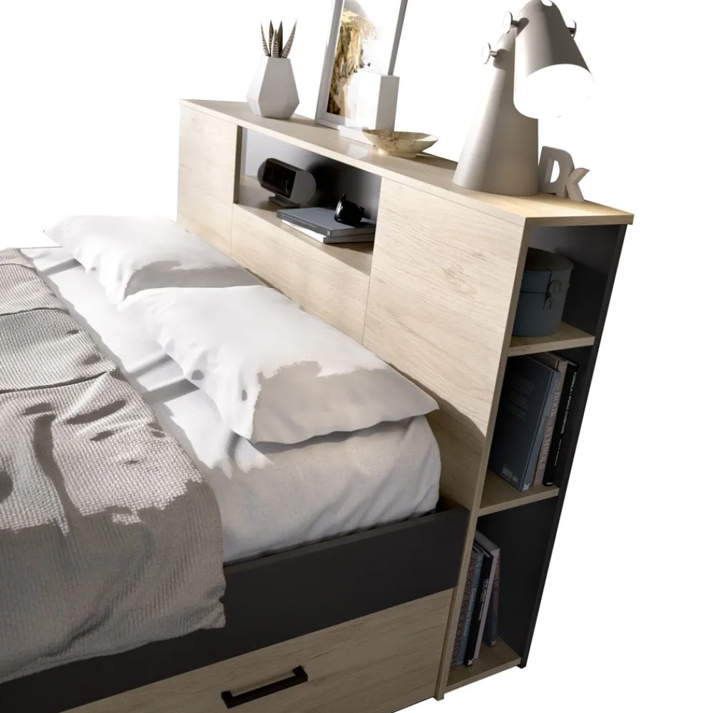 La es la solución ideal para habitaciones que necesitan maximizar el espacio disponible. Esta cama, diseñada en color roble natural combinado con grafito, no solo ahorra espacio al no requerir mesitas de noche, ya que van integradas en el cabecero, sino que también proporciona un amplio almacenamiento tanto en el cabecero como bajo la cama.