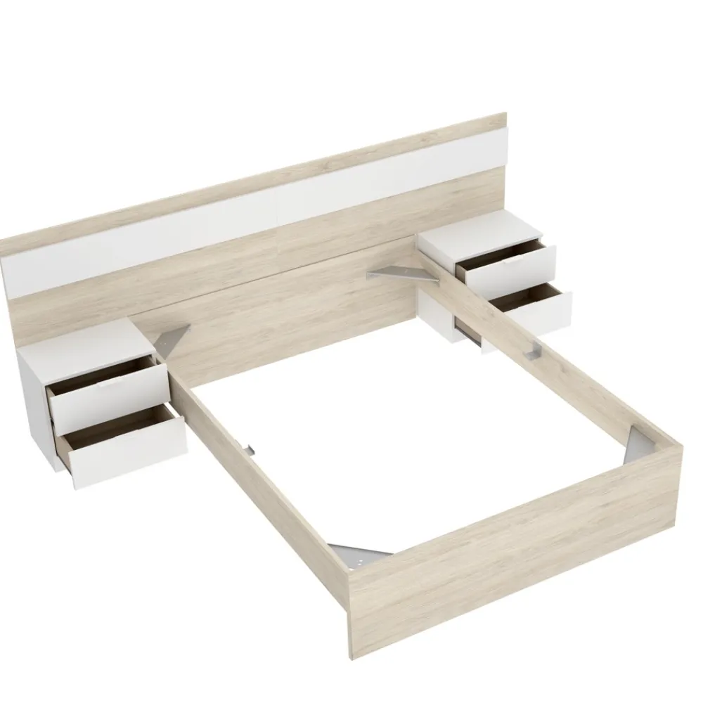 Estructura de cama con cabecero y 2 mesitas de noche Niza de estilo nórdico en color roble natural y blanco. Un conjunto moderno y elegante, ideal para cualquier dormitorio.