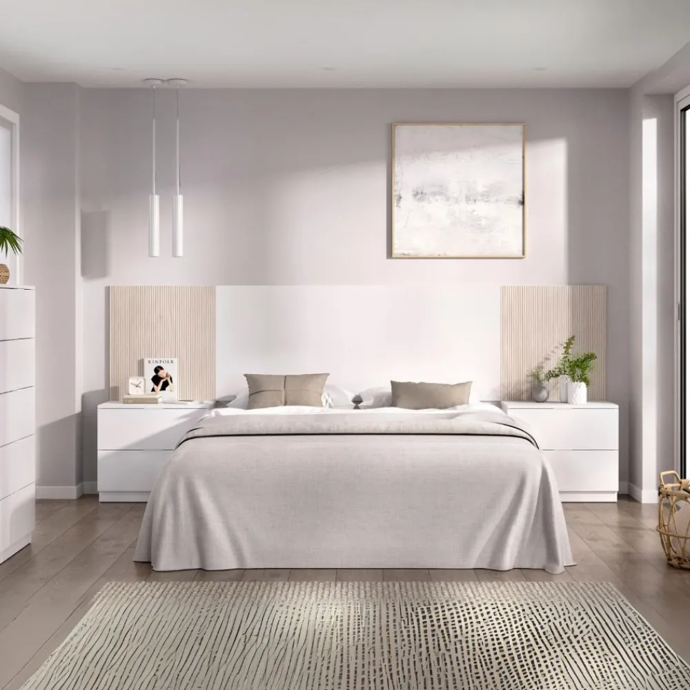Elegante cabecero de cama con dos mesitas y sinfonier, en color blanco mate combinado con alistonado. Un conjunto de muebles de dormitorio moderno que aporta calidez y armonía a tu habitación, y te ayuda a ahorrar al comprar en conjunto.
