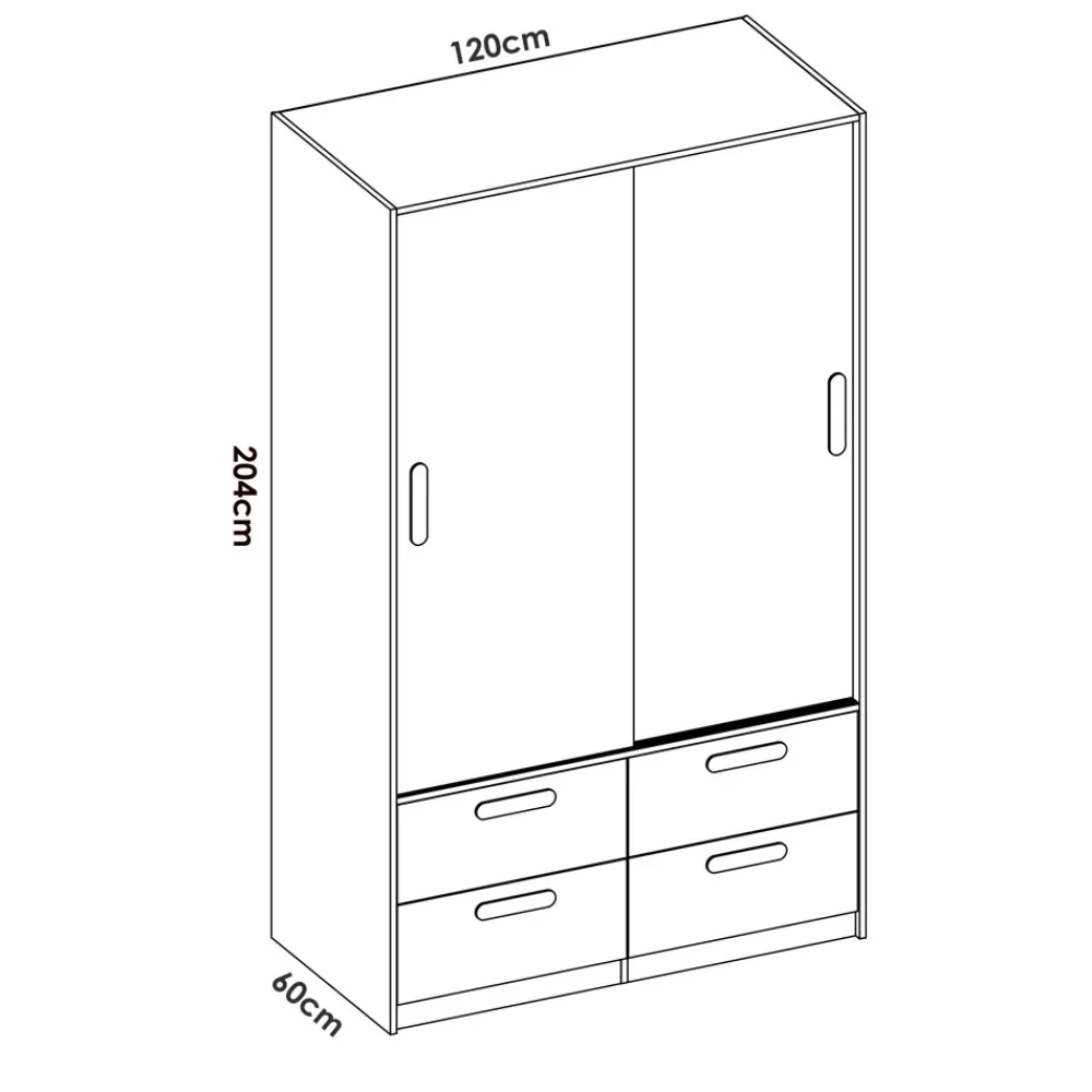 - Armario: 120 cm (ancho) x 204 cm (alto) x 60 cm (fondo)