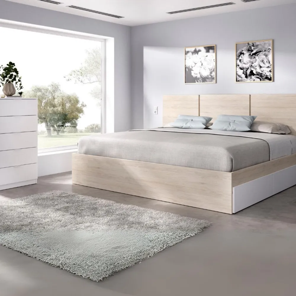 El conjunto Havana está pensado para somieres y colchones de 135-140×190 cm, gracias a sus escuadras metálicas en las esquinas que ofrecen un apoyo firme. Su acabado en color natural y blanco aporta un toque moderno y elegante a cualquier habitación.