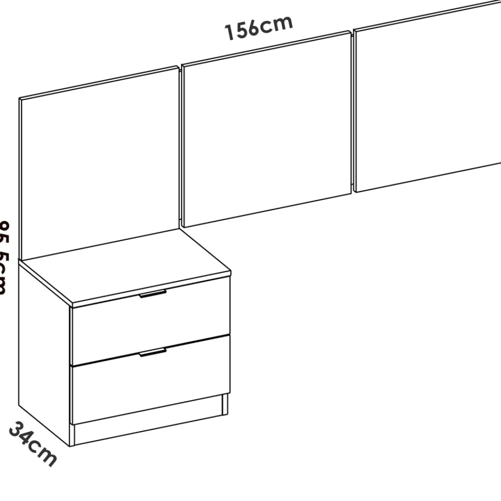 - Cabecero con mesita: 157 cm (ancho) x 96 cm (alto) x 34,2 cm (fondo)