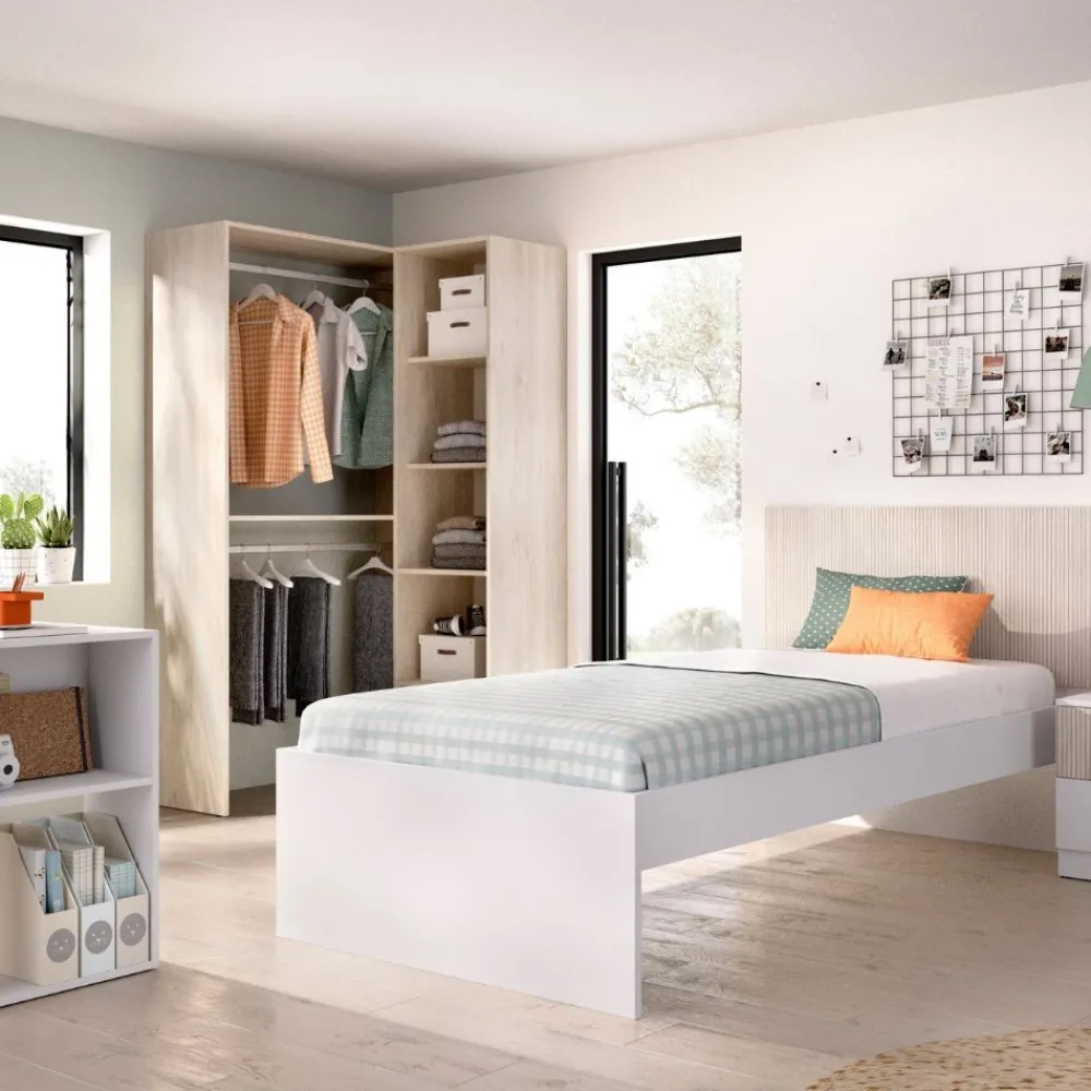 El está diseñado para ofrecer un espacio funcional y elegante, perfecto para los jóvenes. Este conjunto incluye una estructura de cama con un cabecero y una mesilla de noche de dos cajones, un armario de rincón y una mesa escritorio con un cajón, en color blanco y alistonado natural, inspirados en el estilo nórdico que aporta luz y calidez a cualquier habitación.