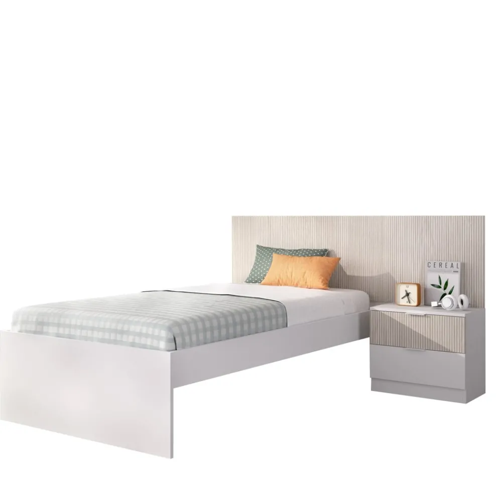 La estructura de cama Lion, con cabecero y mesita integrados, es ideal para optimizar el espacio en el dormitorio juvenil. Su diseño alistonado en blanco y natural aporta un toque moderno y acogedor, perfecto para combinar con diferentes estilos decorativos. La mesita de noche de dos cajones ofrece un espacio adicional para colocar lámparas, libros o cualquier otro objeto personal.