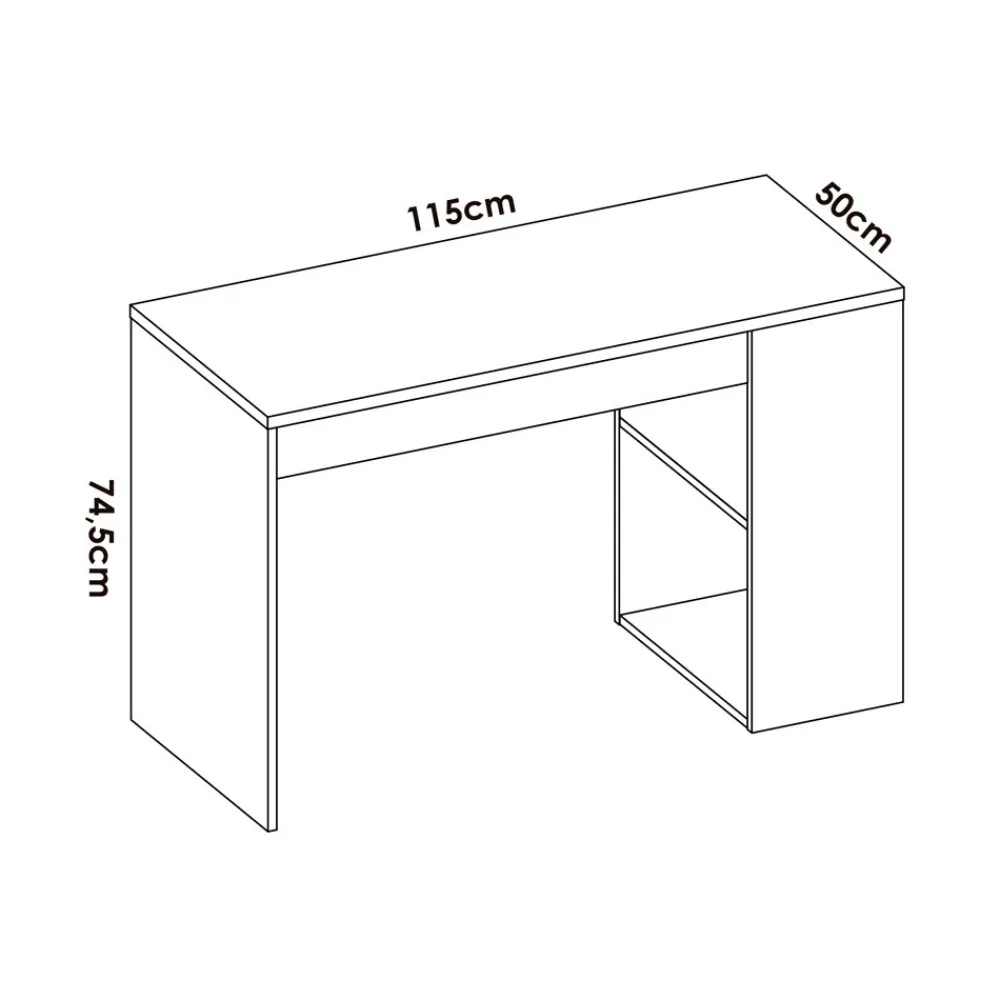 - Mesa escritorio: 115 cm (ancho) x 74 cm (alto) x 50 cm (fondo)