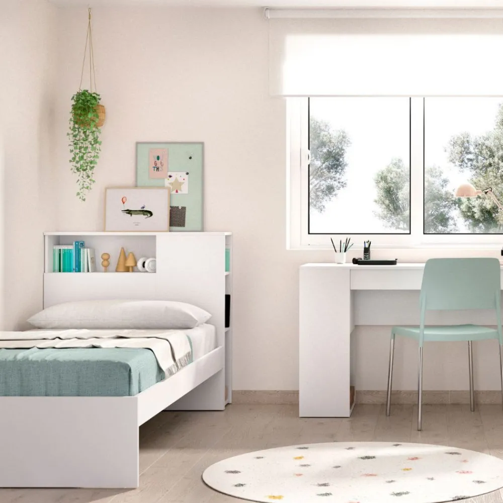 La es perfecta para habitaciones juveniles gracias a su diseño que maximiza el uso del espacio. Este set incluye una cama con cabecero y un escritorio, ambos en un elegante color blanco que combina con cualquier estilo decorativo. La cama presenta un cabecero con estante y mesita integrados, lo que permite un almacenamiento práctico y accesible, ideal para tener a mano libros, despertadores u otros objetos personales.