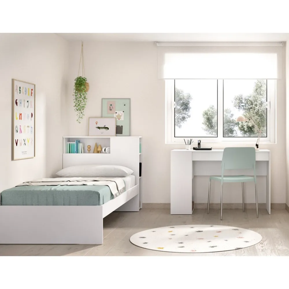 El dormitorio juvenil Ten en color blanco con cabecero y escritorio es la solución ideal para optimizar el espacio en habitaciones juveniles. Con un diseño moderno y funcional, este conjunto incluye una cama con cabecero que integra una mesita y un estante, eliminando la necesidad de muebles adicionales.
