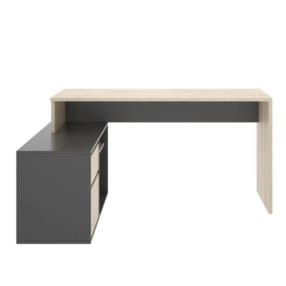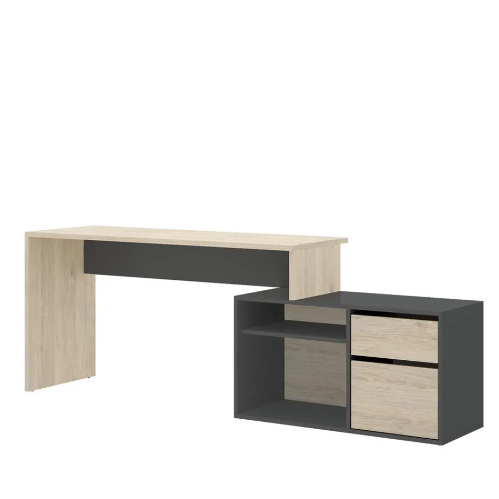 Escritorio rincón Rox en color natural combinado con grafito, se puede montar en forma de “L”. Dispone de una cajonera y librería incorporada. Montaje reversible, puedes colocar el mueble indistintamente a derecha o izquierda. Una mesa de oficina con un precio increíble. Su acabado en colores de estilo nórdico que aporta un toque escandinavo a tu zona de trabajo. También se puede instalar como un escritorio tradicional. Tienes 4 posiciones de montaje