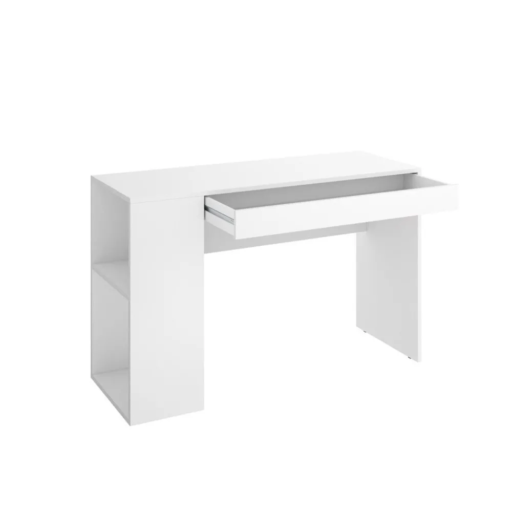 La mesa de escritorio Teo de 115 cm de ancho en color blanco es la mejor solución para amueblar la habitación juvenil. Este escritorio combina diseño con la capacidad de almacenaje que ofrece su estantería lateral y su cajón, perfecta para estudiar o trabajar en casa.