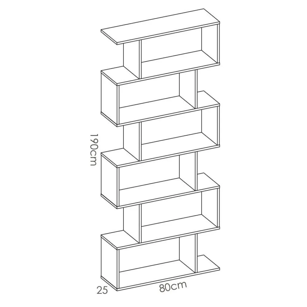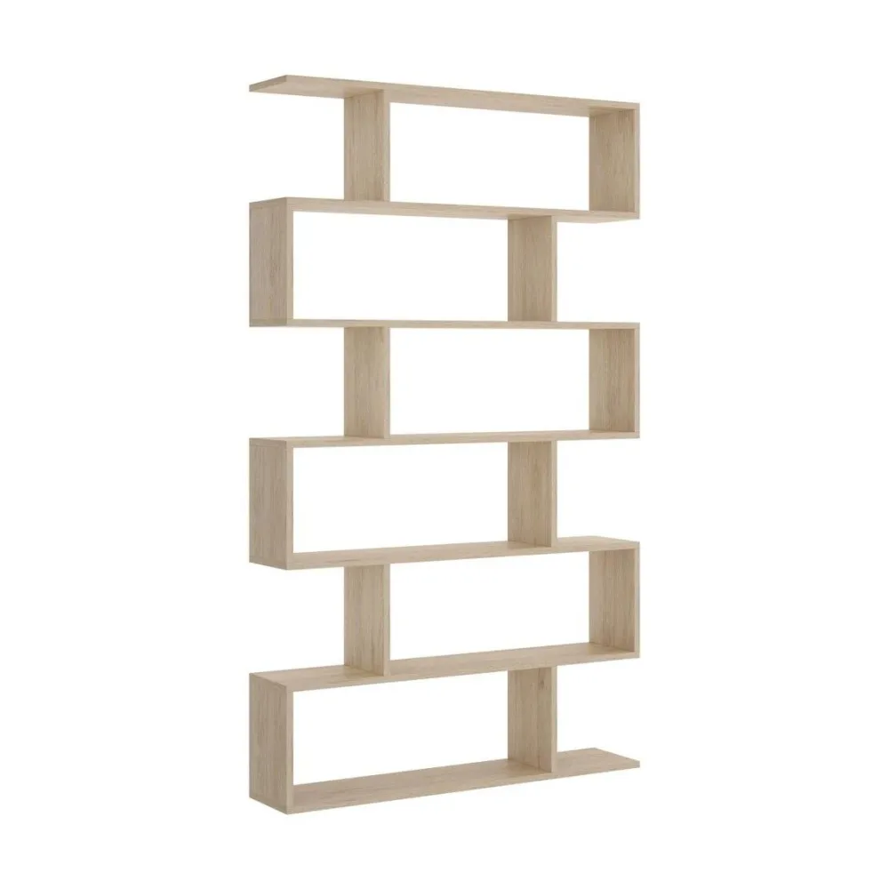 Una bonita estantería en color roble natural que sirve tanto para decorar el salón o cualquier otra habitación de la casa, en forma de zig-zag o cremallera dispone de 6 huecos principales en forma de rectángulo y otros 6 huecos al aire en los que también puedes colocar objetos decorativos.