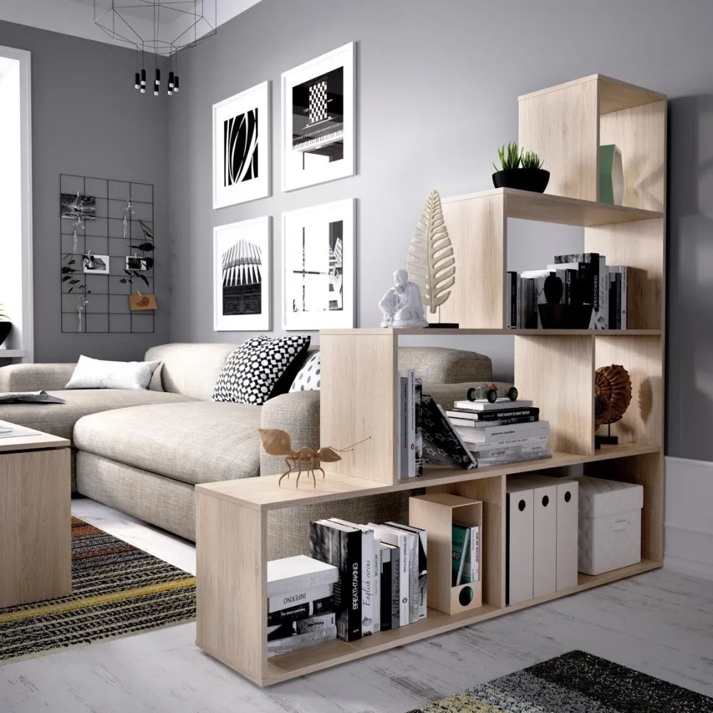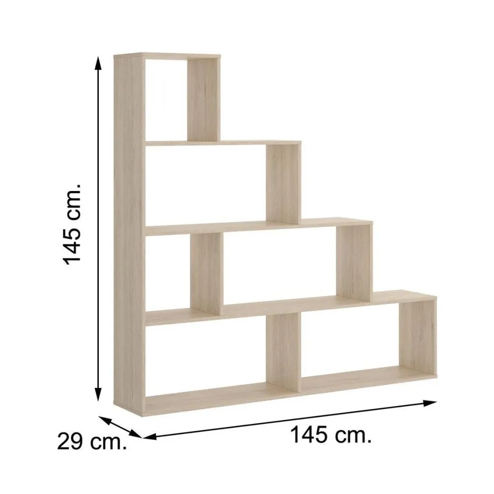 La estantería Ten con un diseño de estilo nórdico, moderno en forma de escalera aumenta la capacidad de almacenamiento de tu salón o dormitorio. Una estantería en color madera roble natural de seis huecos irregulares que ayuda en la separación de ambientes.