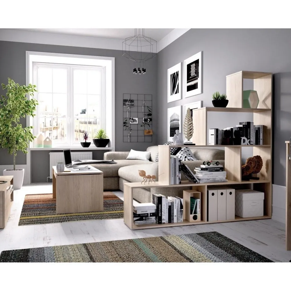 La estantería librería Ten en color roble natural es muy bonita y perfecta para colocar como separación de dos ambientes diferentes, su diseño en forma de escalera aporta un toque de originalidad a tu salón o dormitorio. La u objetos decorativos Ten está realizada en tablero de partículas de primera calidad revestido de melamina en color madera roble natural.