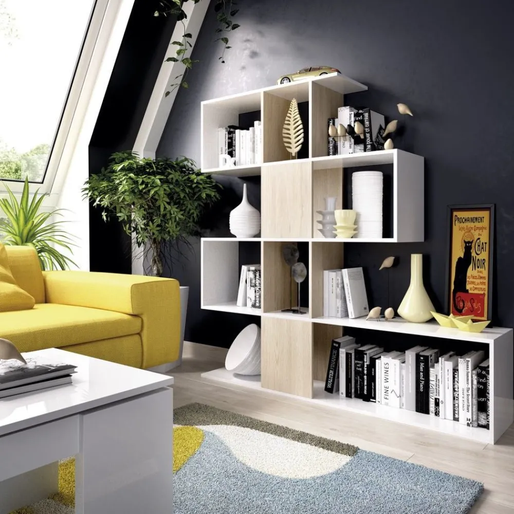 Una estantería con un divertido diseño en forma zigzag, así es la librería Funk, queda muy bien integrada en cualquier ambiente gracias a su acabado en color blanco brillo y roble natural