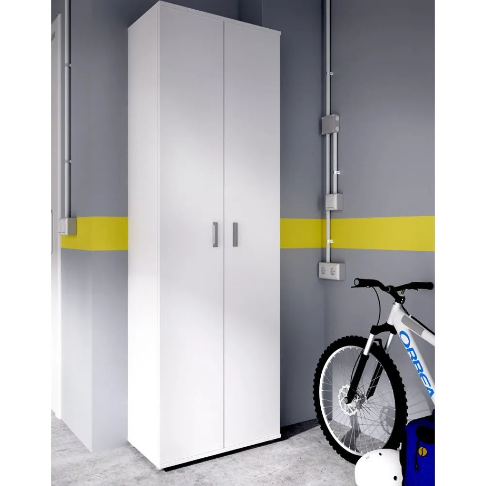 Un armario multiusos con patas regulables en altura en color blanco, así es el mueble Low Cost Fit, un armario de dos puertas y tres estantes interiores, dos de ellos regulables en altura, que puedes colocar en el garaje o cualquier otro lugar de la casa.
