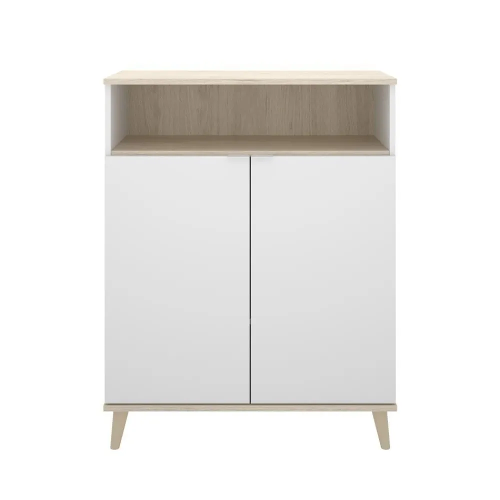 Armario de cocina bajo con dos puertas y un hueco. Muy funcional para tener la vajilla siempre a mano en nuestra cocina. Diseño de tipo nórdico gracias a su acabado en blanco combinado con natural, cambia la decoración de tu cocina por muy poco dinero.
