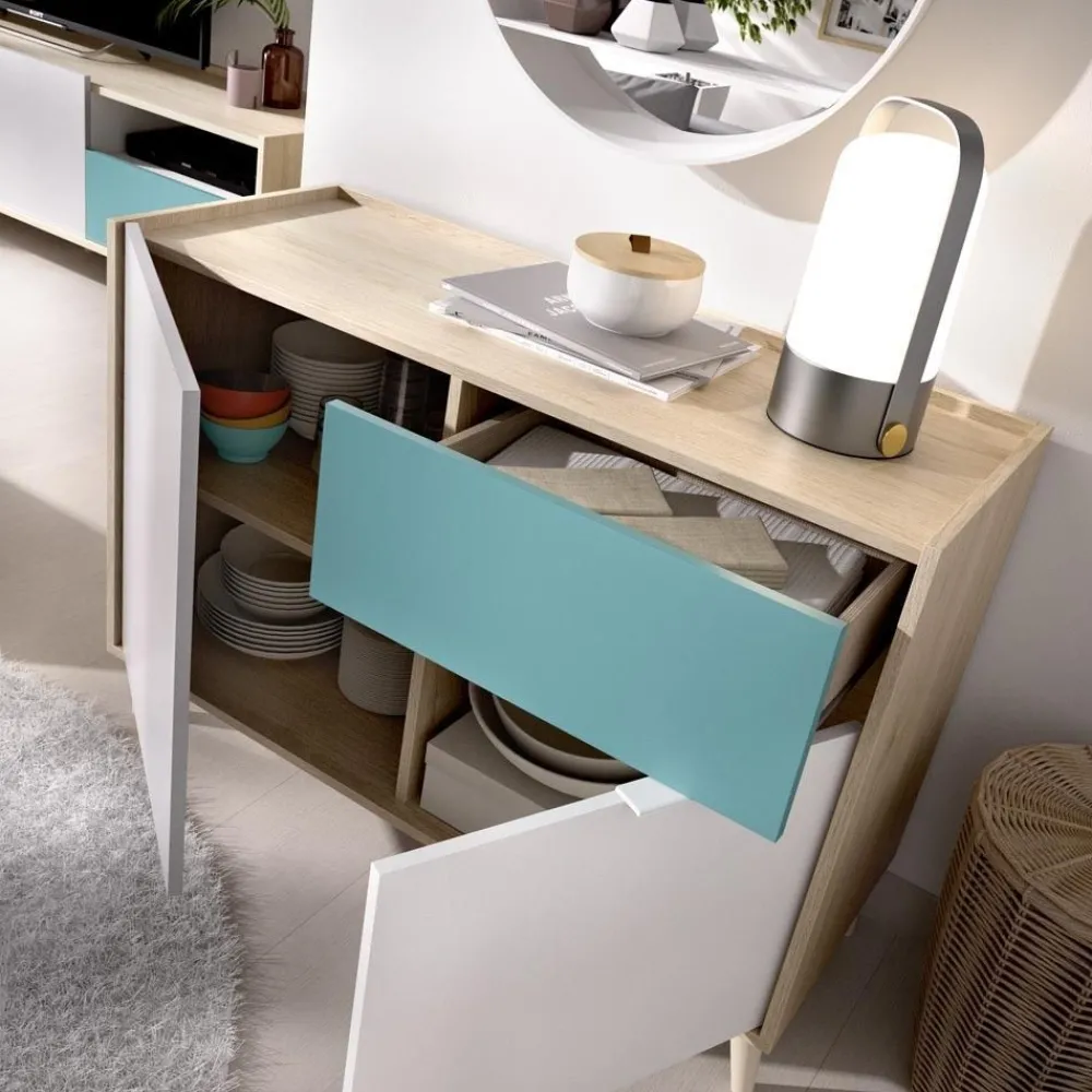 Mueble aparador de diseño atractivo con tres puertas, acabado de colores combinados, natural, gris, esmeralda y blanco. Perfecto para cualquier rincón de la casa en el que precises de un mueble para ampliar la capacidad de almacenamiento. Combina con los muebles de la serie Nova