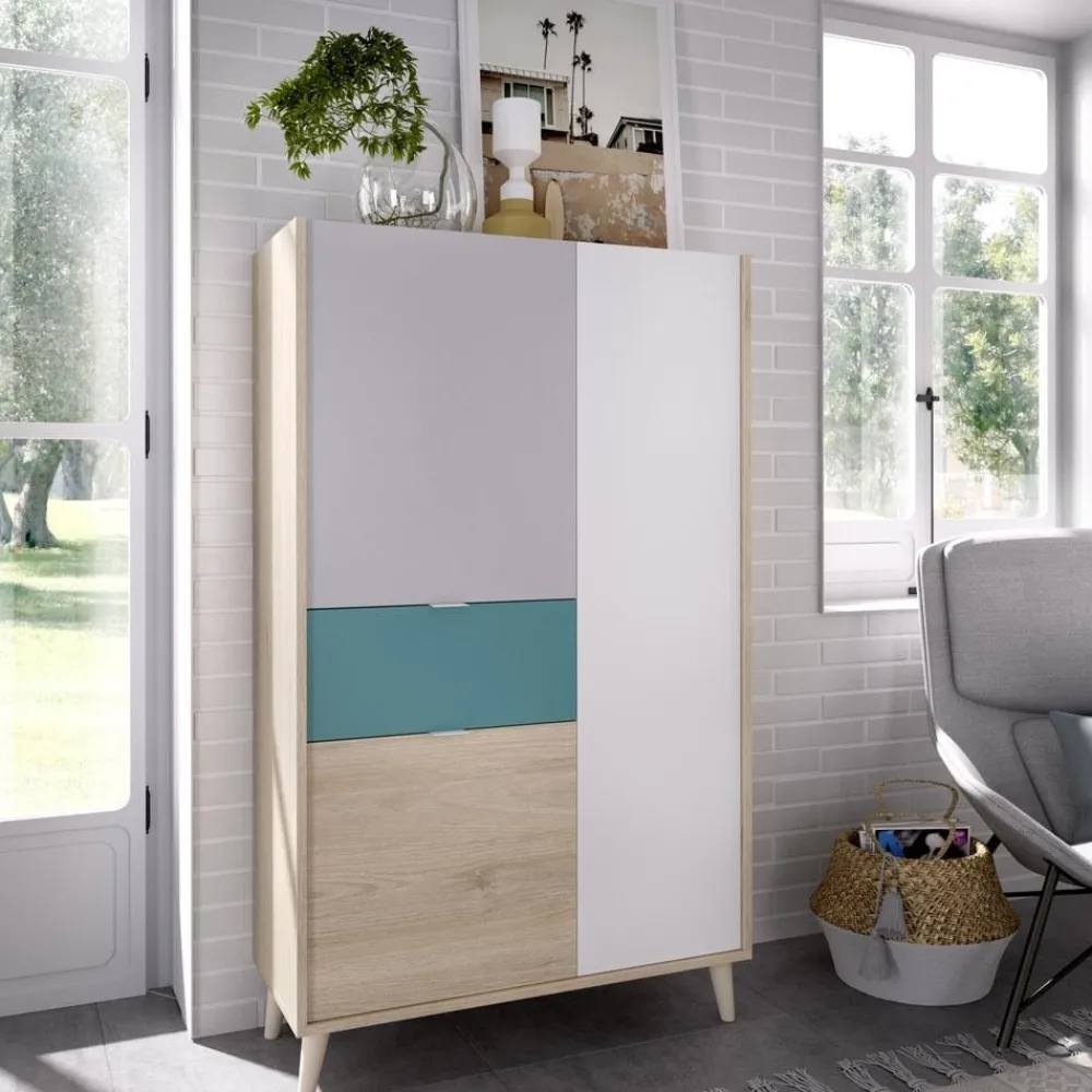 Mueble aparador alto, de tres puertas, de colores combinados esmeralda, natural, gris y blanco. Con él tendrás tu salón siempre ordenado, ya que dispone de tres compartimentos para almacenaje y un cajón.