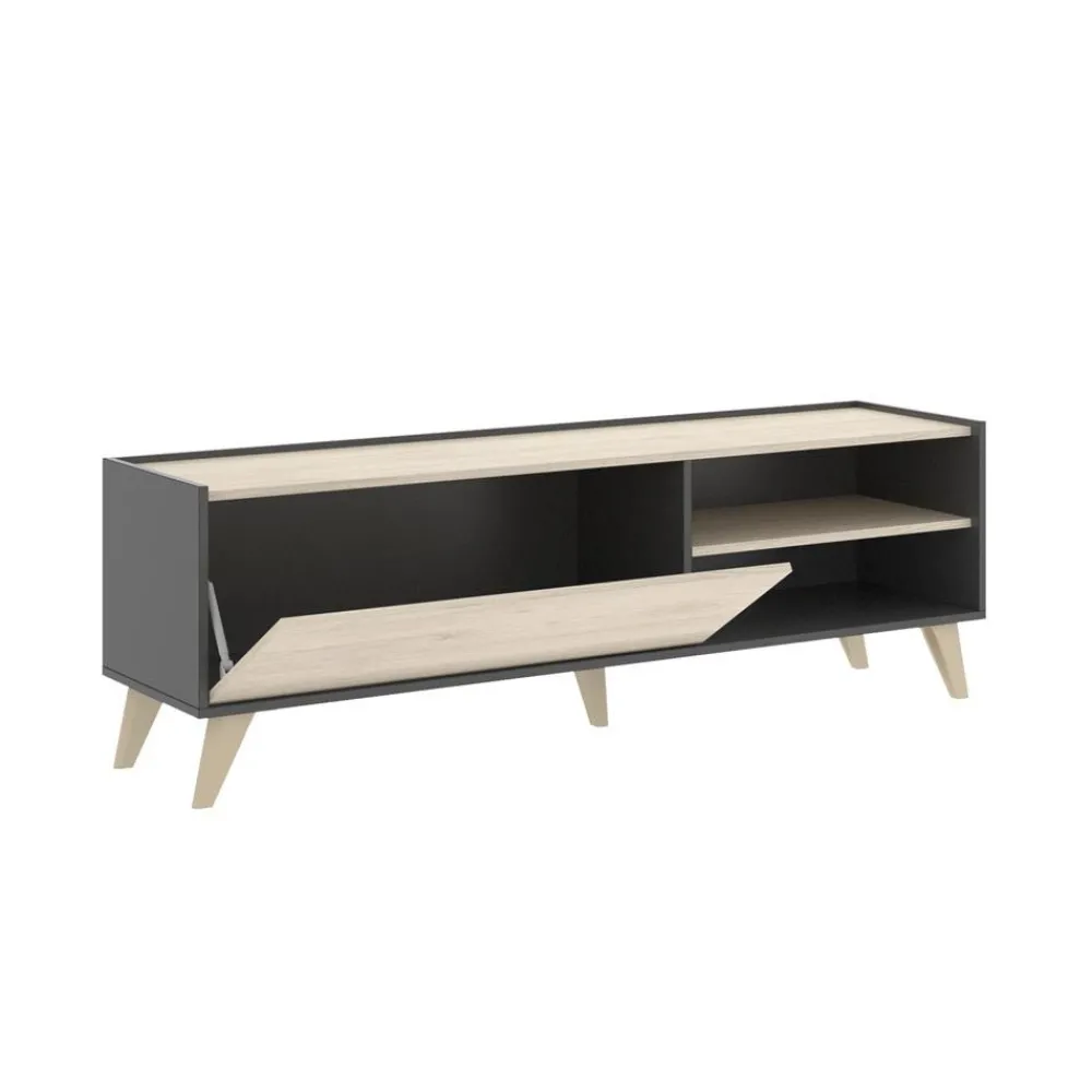 Mueble de estilo nórdico, en color natural combinado con grafito, para televisores de hasta 65”. Su reducido tamaño y su cuidada distribución proporcionan el espacio suficiente para almacenar una gran cantidad de objetos.