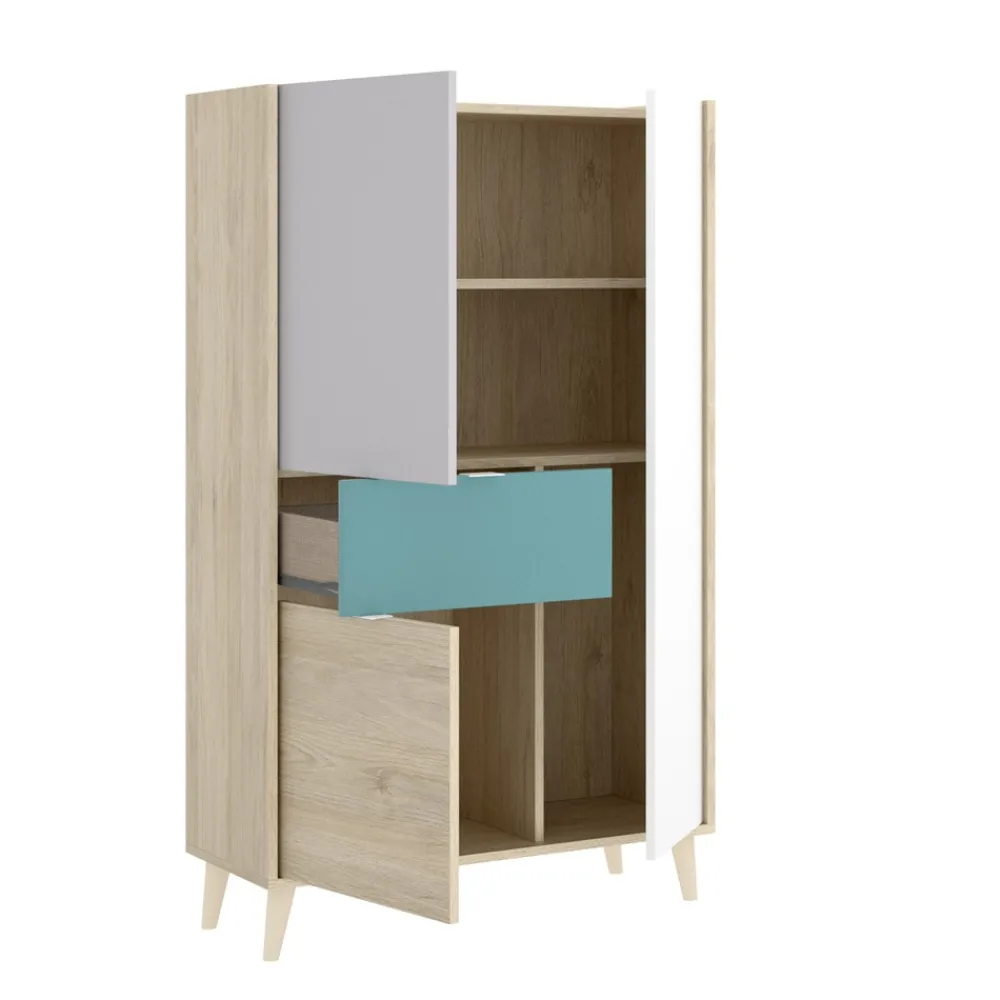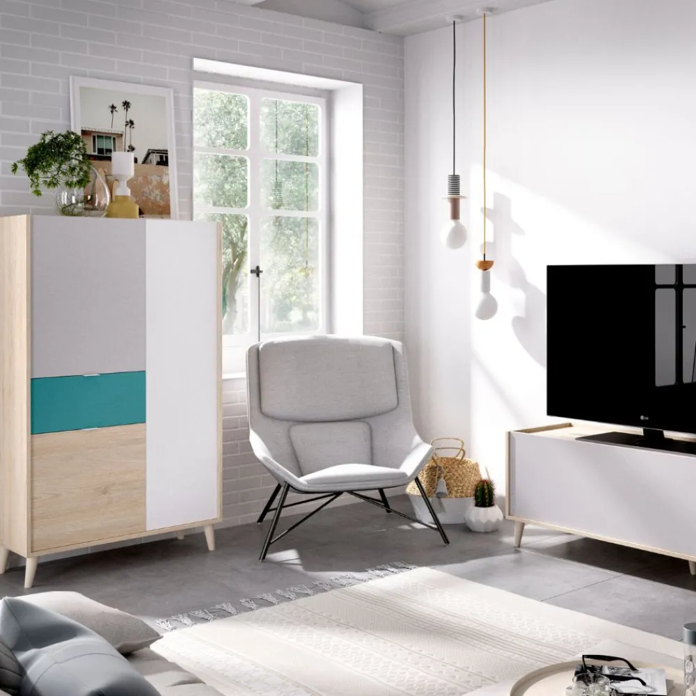 Conjunto de muebles de salón compuesto por un práctico mueble de televisión con un hueco multimedia, una puerta batiente y un cajón, se completa con un elegante aparador alto de tres puertas y un cajón central. Un conjunto de estilo moderno en color natural, gris, esmeralda y blanco, perfecto para amueblar cualquier salón.