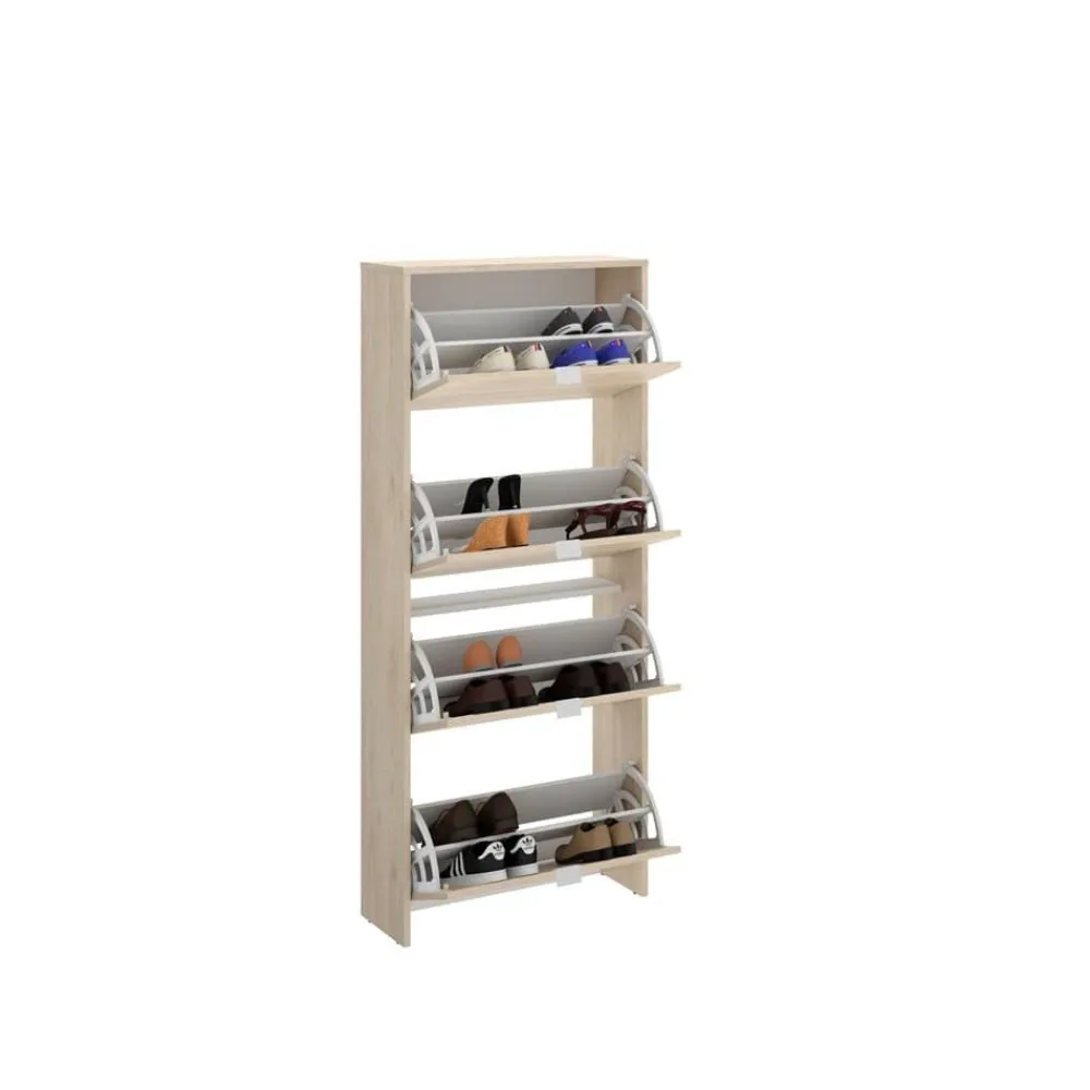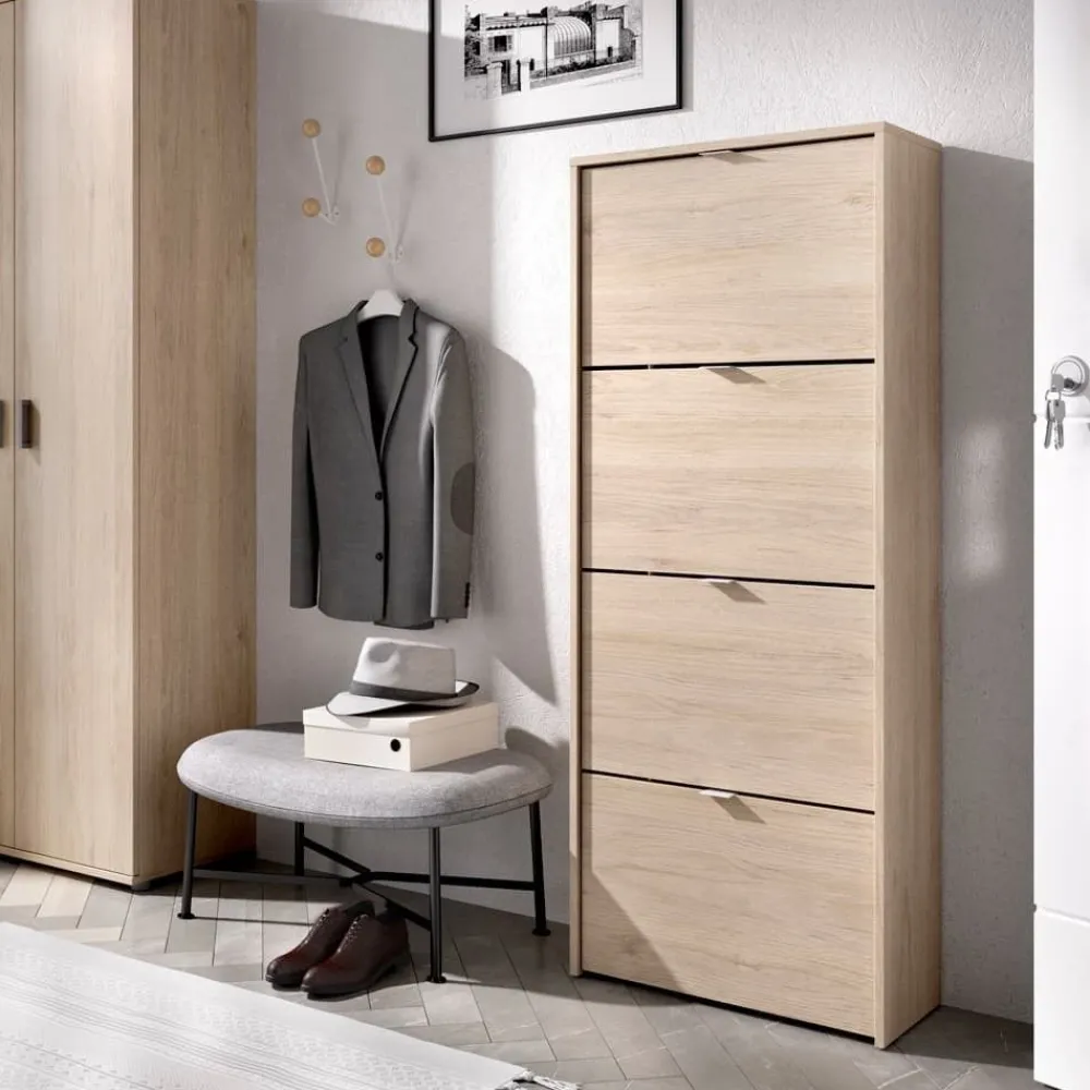 Elegante mueble zapatero con cuatro puertas batientes, en color roble Natural, con tiradores en ABS color blanco. Con capacidad hasta para 16 pares de zapatos, siempre bien ordenados y listos para su uso.