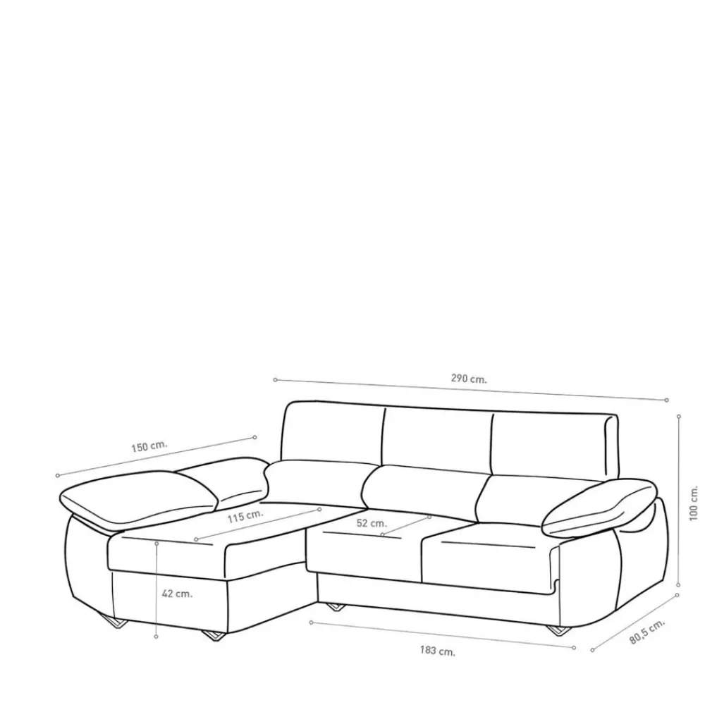 - Sofá chaise longue con arcón: 290 cm (ancho) x 100 cm (alto) x 80,5 cm (fondo de sofa) – 150 cm (fondo chaise longue)
