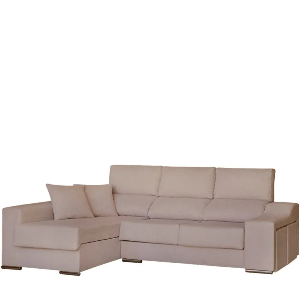 El sofá chaise longue Sevilla es la opción ideal para quienes buscan un mueble elegante y funcional. Su tapizado en tela Nevada Beige con tratamiento antilíquidos garantiza durabilidad, mientras que su arcón y dos puffs integrados lo hacen perfecto para aprovechar el espacio en cualquier salón moderno.