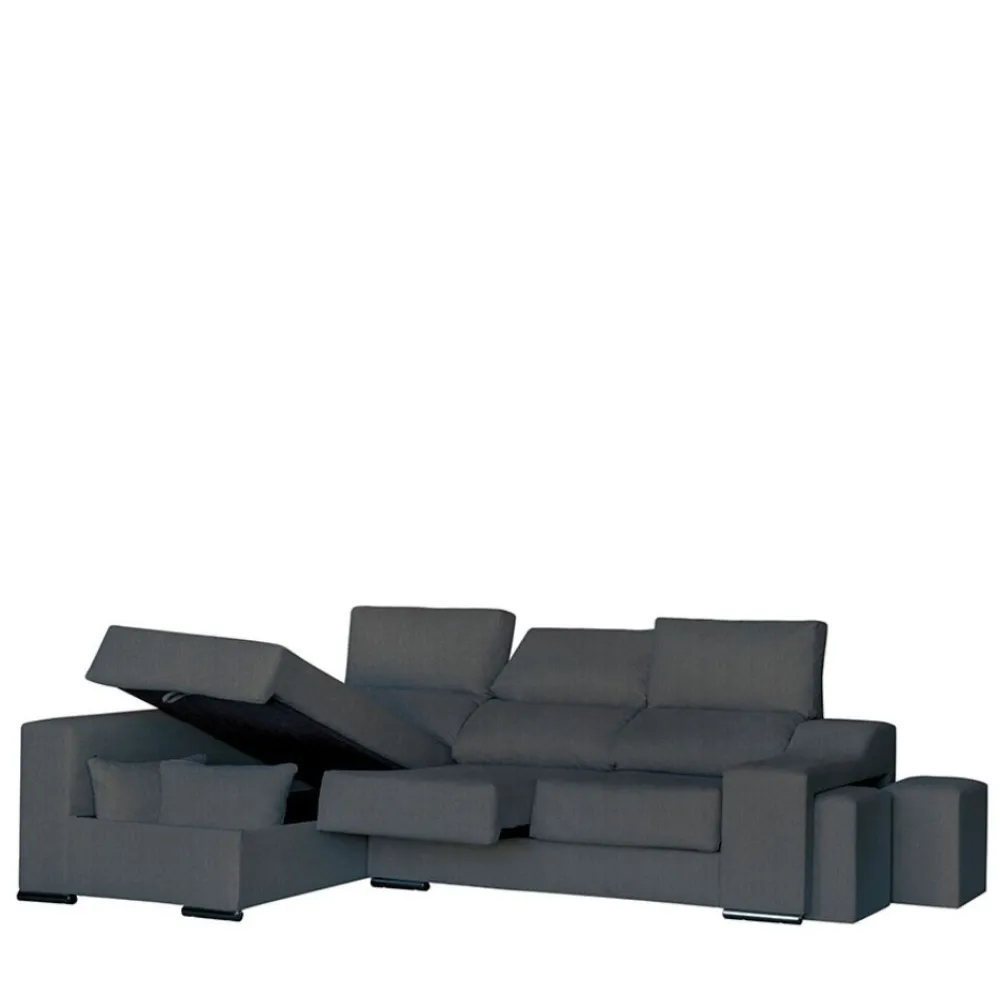 Sofá chaise longue con arcón y dos puffs Sevilla en tela gris oscuro