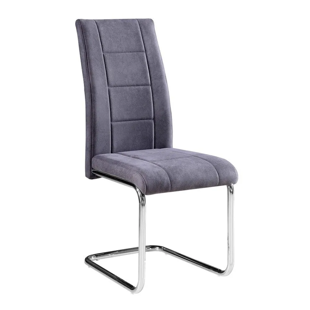 El respaldo está decorado con una franja de cuadrados en la parte central, resaltados con hilo, lo que añade un toque de elegancia y distinción a esta silla. La silla de salón San Sebastián está disponible en un elegante color marengo y cuenta con patas cromadas en forma de “U” que ofrecen una sensación de balanceo sutil y agradable.
