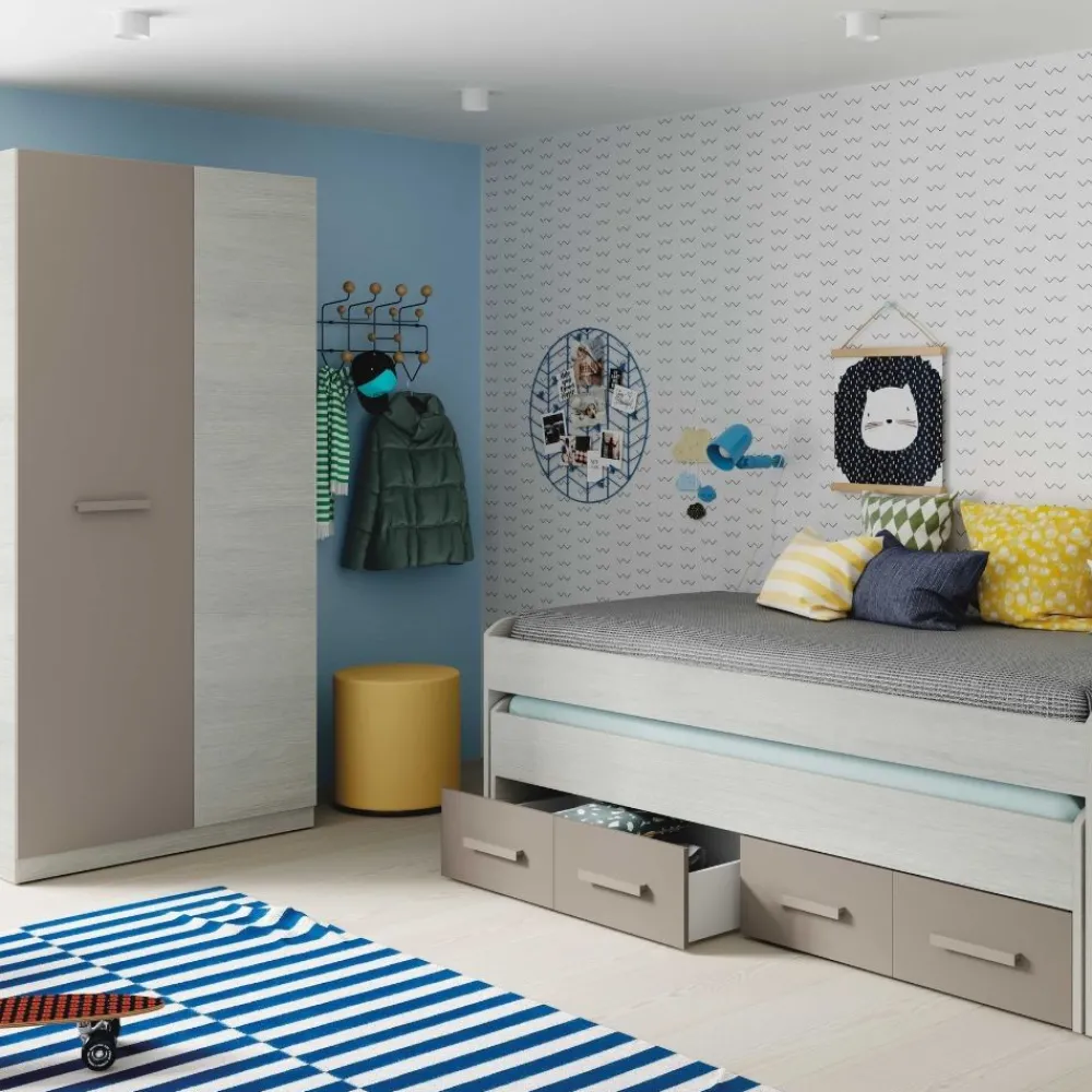 El acabado en combina fácilmente con muchos estilos y colores, por lo que puedes integrarlo sin problemas en cualquier dormitorio juvenil. Si buscas un conjunto coordinado, el combina a la perfección con la cama nido Ares Plus y la mesa de estudio Star, creando un dormitorio juvenil completo, práctico y con mucho estilo.