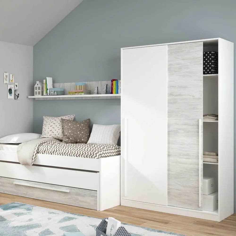 La mejor manera de guardar la ropa en una habitación infantil es con el de dos puertas correderas Elliot en color blanco Artik y Velho, es el complemento perfecto para lacama nido del mismo nombre o para colocar suelto, pues su amplia capacidad, su tamaño de 120 cm (armario estrecho) y con fondo reducido de 50 cm, lo hacen perfecto incluso para habitaciones de pequeño tamaño.