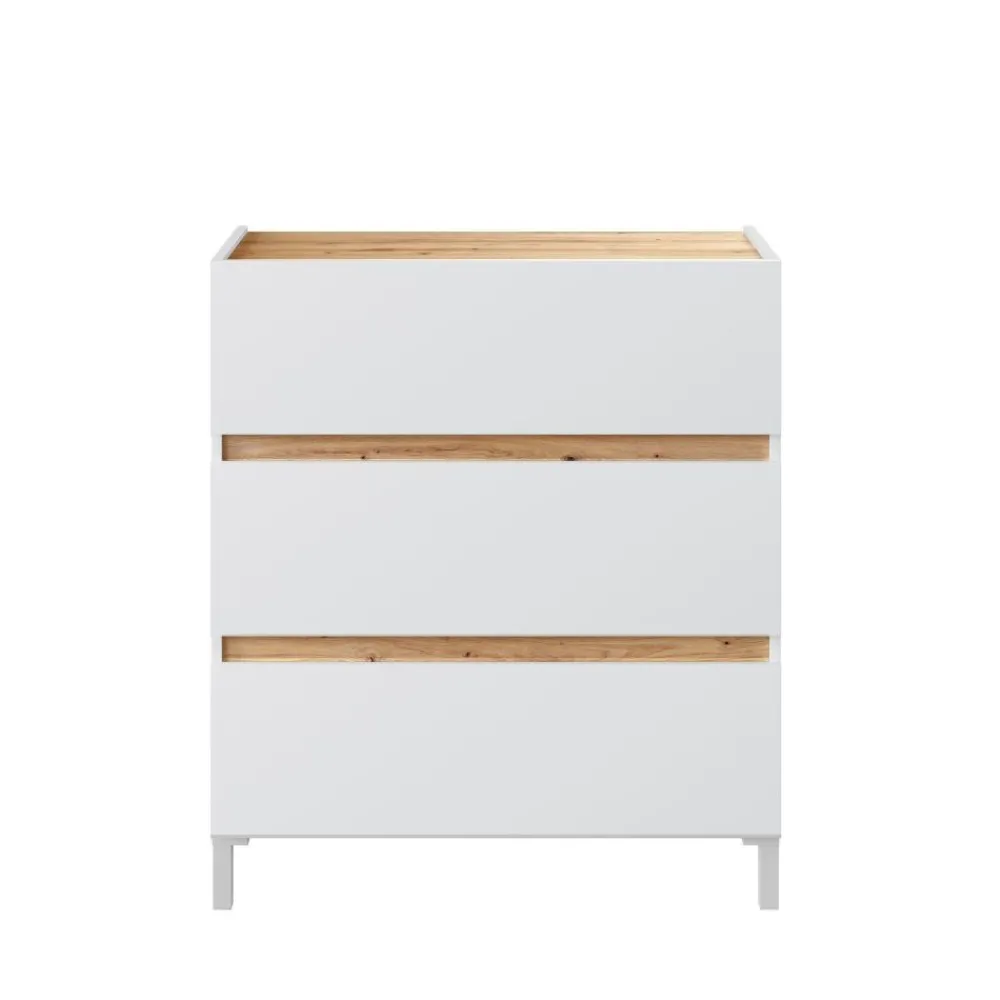 Cómoda para dormitorio con patas de estilo nórdico Tempus, amplía la capacidad de almacenamiento de tu dormitorio con esta cajonera de 3 cajones de estructura en color blanco Artik y tapa y detalles en el frente color roble Nodi.