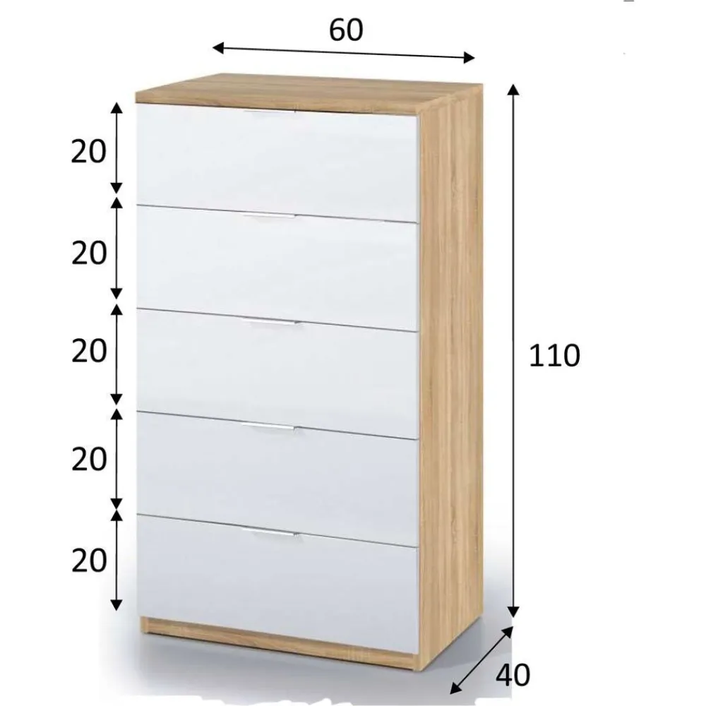 Mueble cajonero para dormitorio, sinfonier de 5 cajones, estructura en color roble Canadian, frentes de cajón en color blanco.
