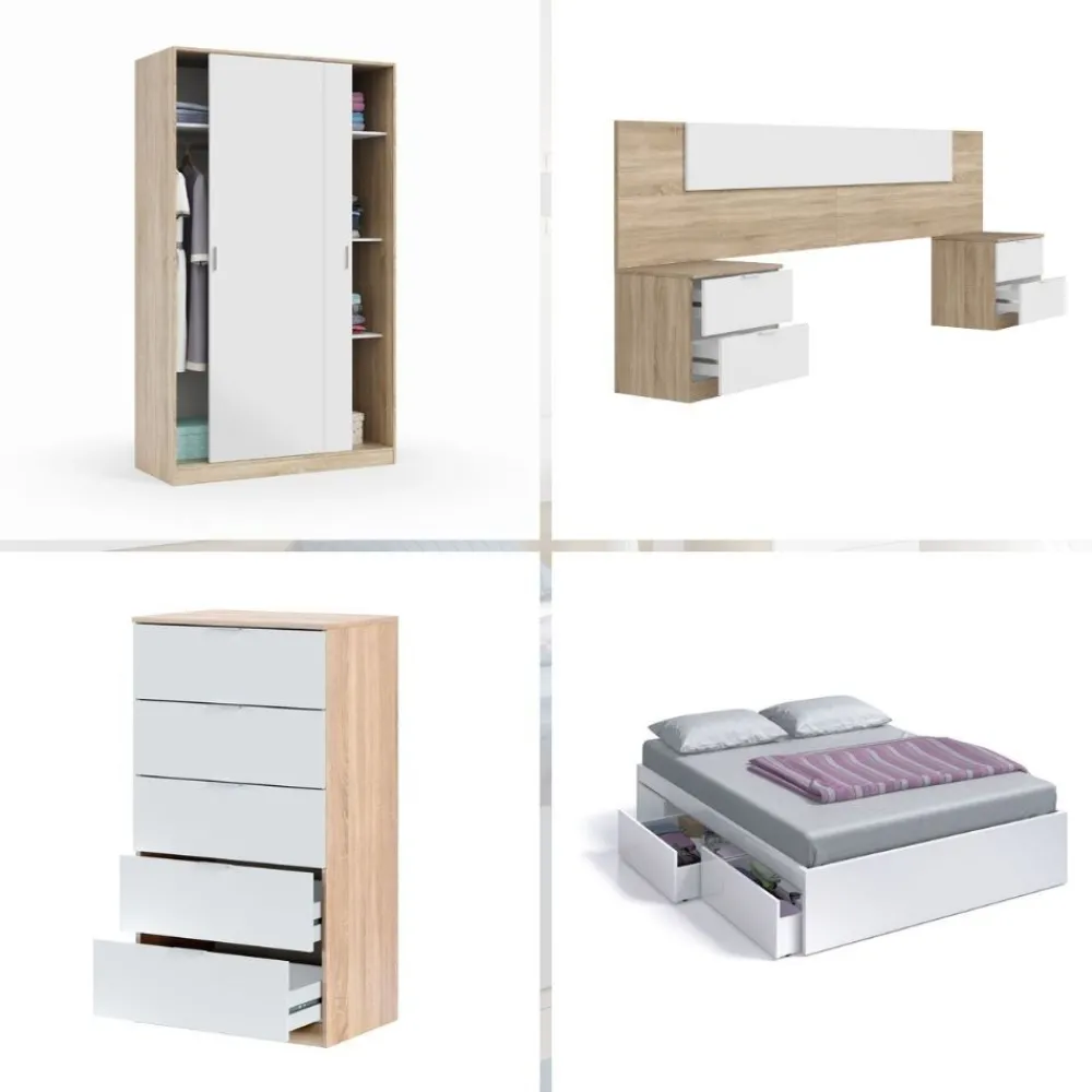 ¡Eleva tu dormitorio a un nuevo nivel de diseño con la oferta de dormitorio completo Alaya, que incluye un cabecero de cama, dos mesillas de noche, un sinfonier de 5 cajones, un armario con dos puertas correderas y una cama de cuatro cajones. Diseño minimalista en color blanco Artik combinado con roble Canadian.