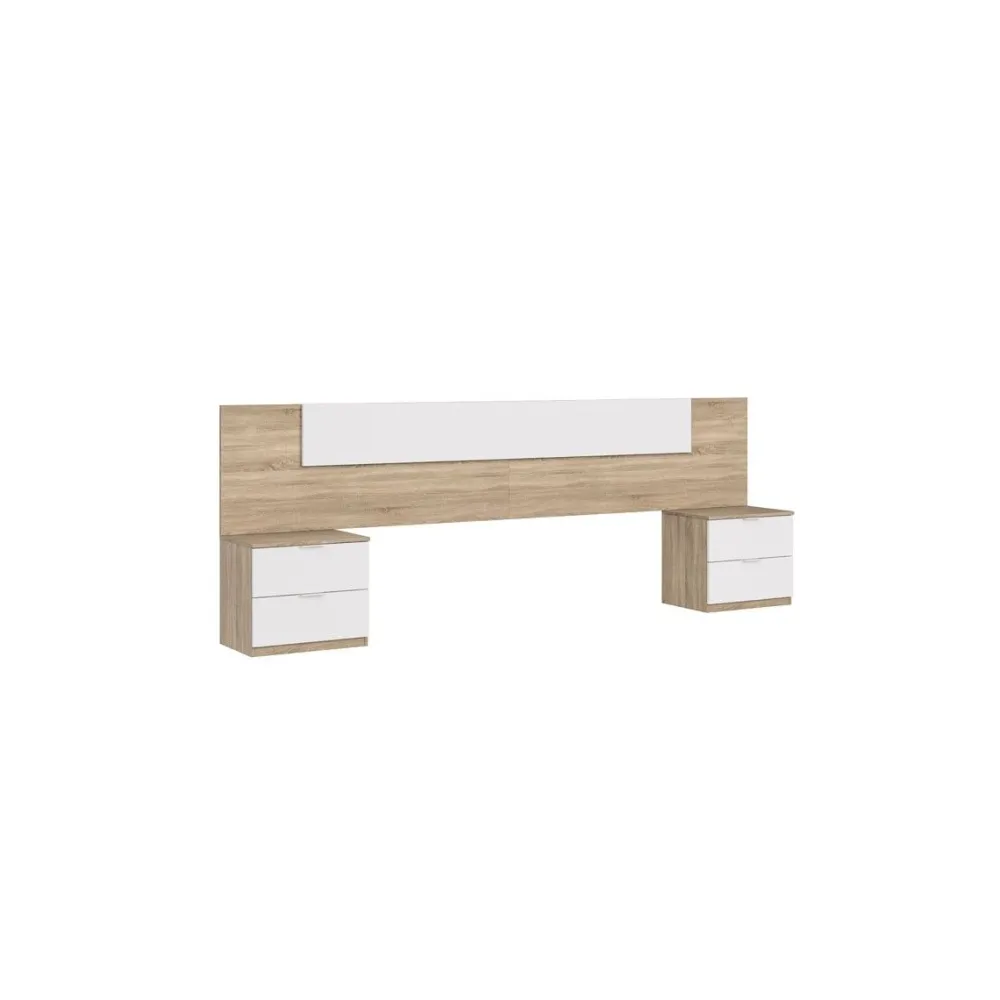 El dormitorio Alaya está compuesto por un cabecero colgante y dos mesitas en color de estilo nórdico, roble Canadian y blanco Artik.